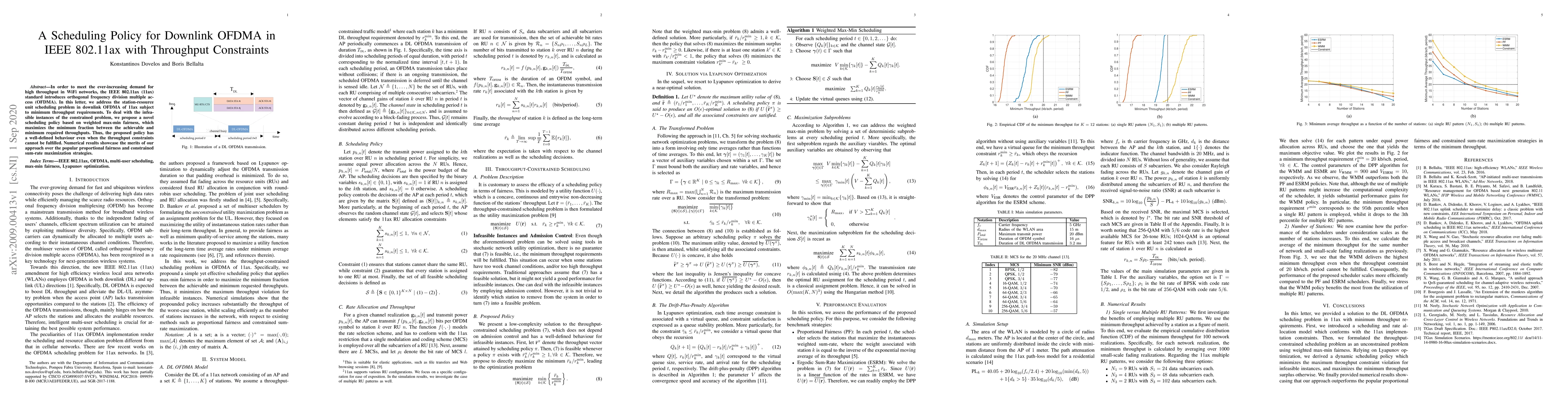 This paper proposes a novel scheduling policy for downlink OFDMA in IEEE 802.11ax to meet minimum throughput requirements, based on weighted max-min fairness. The policy maximizes the minimum fraction of achievable to required throughputs, ensuring performance even when constraints are infeasible.
