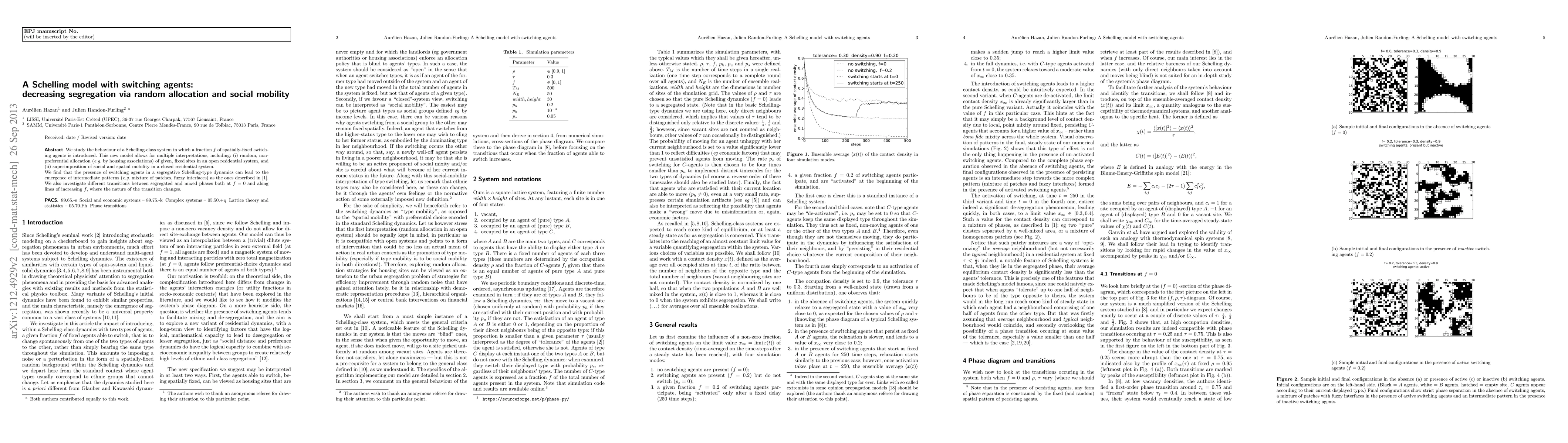 This paper explores a Schelling-class model with switching agents, finding that random allocation and social mobility can decrease segregation, leading to intermediate patterns like mixed patches and fuzzy interfaces. The study examines transitions between segregated and mixed phases as the fraction of switching agents increases.