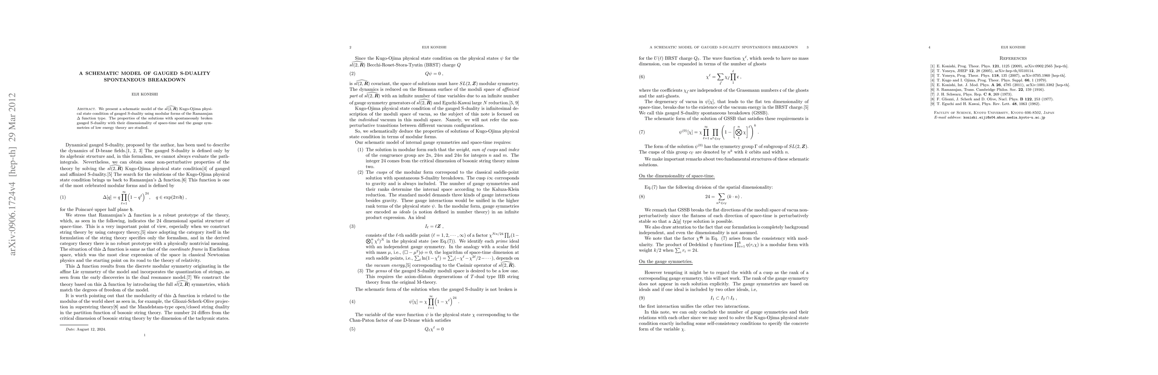 We present a schematic model of the \hat{sl(2,R})} Kugo-Ojima physical state condition of gauged S-duality using modular forms of the Ramanujan \Delta function type. The properties of the solutions with spontaneously broken gauged S-duality with their dimensionality of space-time and the gauge symmetries of low energy theory are studied.