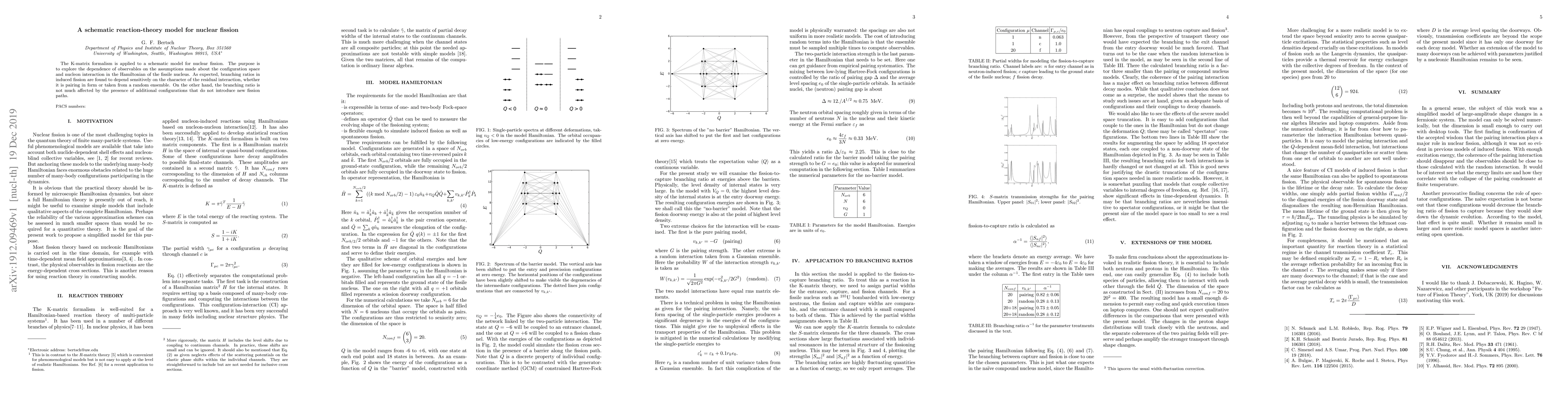 The introduction of a schematic reaction-theory model for nuclear fission, utilizing the K-matrix formalism to analyze the dependence on configuration space and nucleon interaction assumptions.
