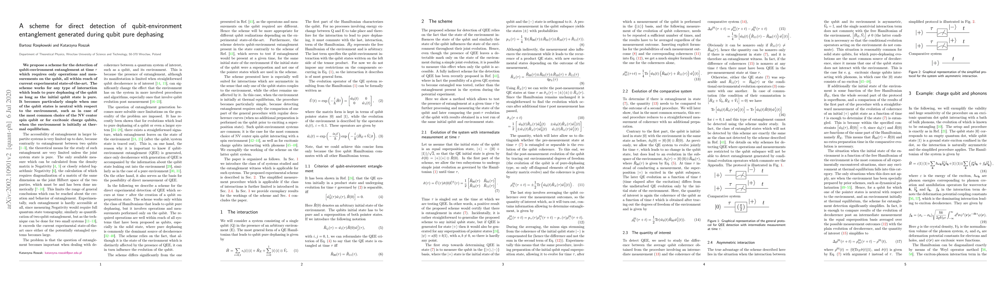 We propose a scheme for the detection of qubit-environment entanglement at time $\tau$ which requires only operations and measurements on the qubit, all within reach of current experimental state-of-the-art. The scheme works for any type of interaction which leads to pure dephasing of the qubit as long as the initial qubit state is pure. It becomes particularly simple when one of the qubit states is neutral with respect to the environment, such as in case of the most common choice of the NV center spin qubit or for excitonic charge qubits, when the environment is initially at thermal equilibrium.