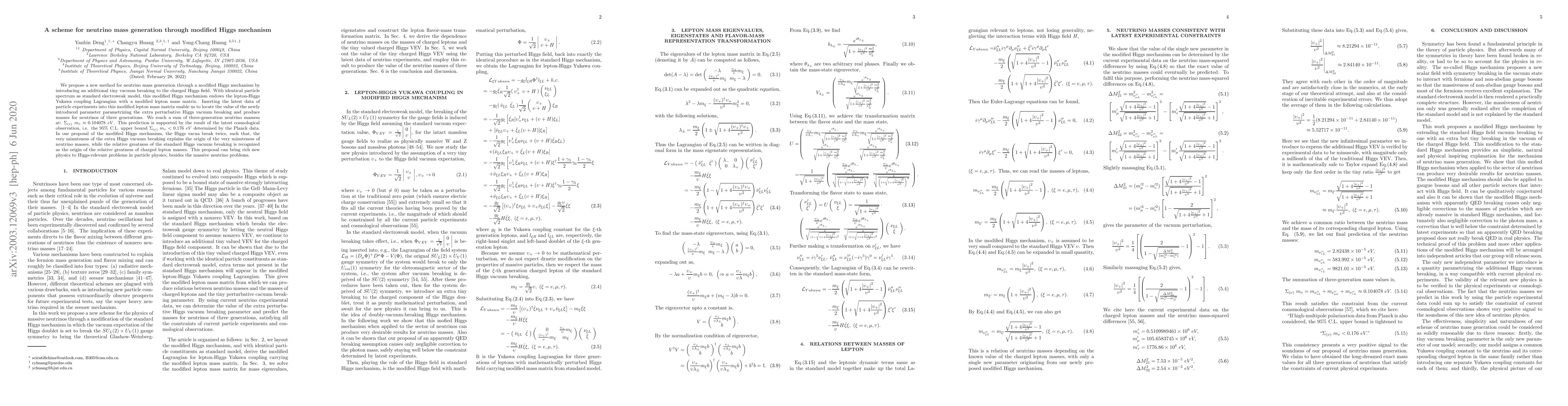 We propose a new method for neutrino mass generation through a modified Higgs mechanism by introducing an additional tiny vacuum breaking to the charged Higgs field. With identical particle spectrum as standard electroweak model, this modified Higgs mechanism endows the lepton-Higgs Yukawa coupling Lagrangian with a modified lepton mass matrix. Inserting the latest data of particle experiments into this modified lepton mass matrix enable us to locate the value of the newly introduced parameter parametrizing the extra perturbative Higgs vacuum breaking and produce masses for neutrinos of three generations. We reach a sum of three-generation neutrino massess at: $\Sigma_{(\nu)} ~ m_{\nu} \approx 0.104078 ~eV$. This prediction is supported by the result of the latest cosmological observation, i.e. the 95\% C.L. upper bound $\Sigma_{(\nu)} ~ m_{\nu} < 0.176 ~eV$ determined by the Planck data. In our proposal of the modified Higgs mechanism, the Higgs vacua break twice, such that, the very minuteness of the extra Higgs vacuum breaking explains the origin of the very minuteness of neutrino masses, while the relative greatness of the standard Higgs vacuum breaking is recognized as the origin of the relative greatness of charged lepton masses. This proposal can bring rich new physics to Higgs-relevant problems in particle physics, besides the massive neutrino problems.