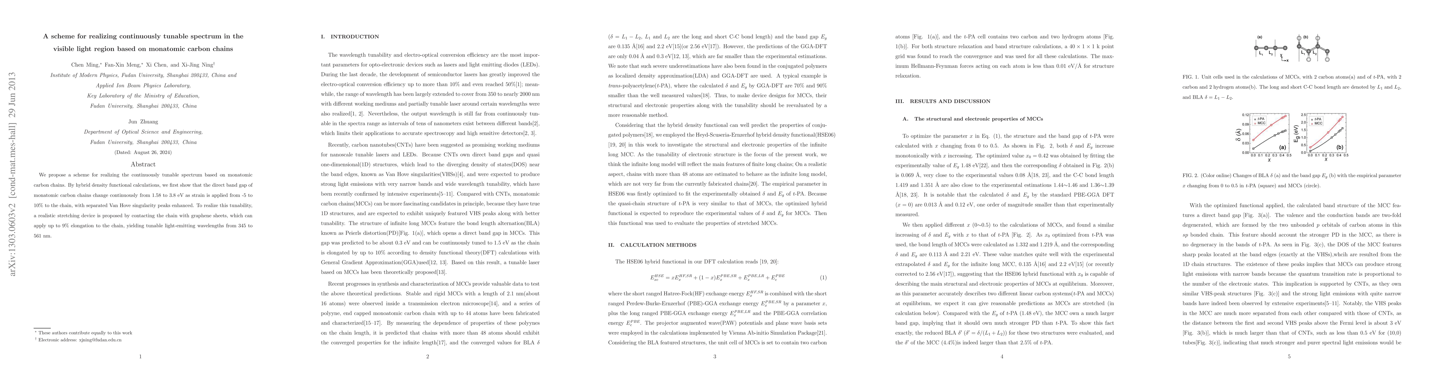 This paper proposes a method for achieving a continuously tunable spectrum in the visible light region using monatomic carbon chains, showing that their band gap changes from 1.58 to 3.8 eV with strain. A device combining the chains with graphene sheets is suggested to achieve up to 9% elongation, enabling tunable light emission from 345 to 561 nm.