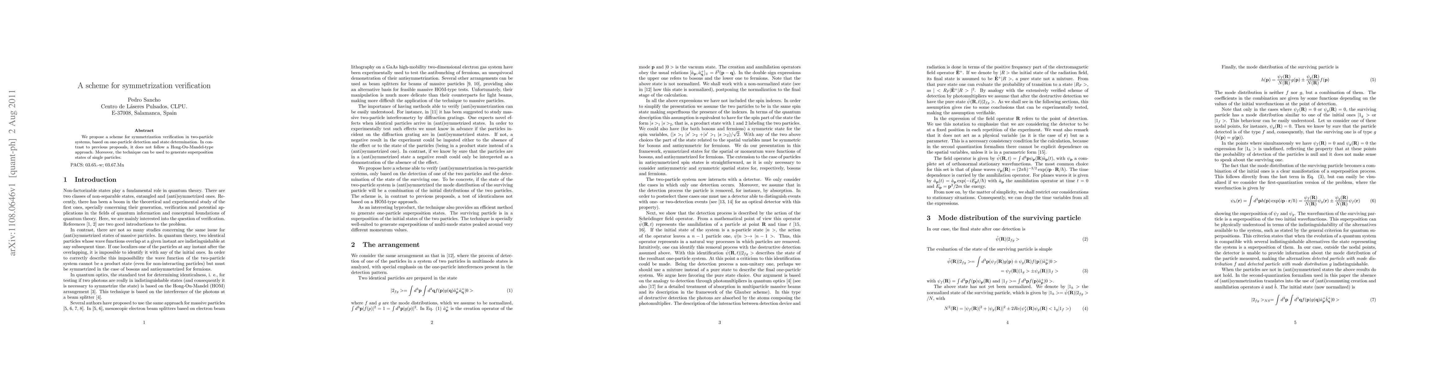 We propose a scheme for symmetrization verification in two-particle systems, based on one-particle detection and state determination. In contrast to previous proposals, it does not follow a Hong-Ou-Mandel-type approach. Moreover, the technique can be used to generate superposition states of single particles.