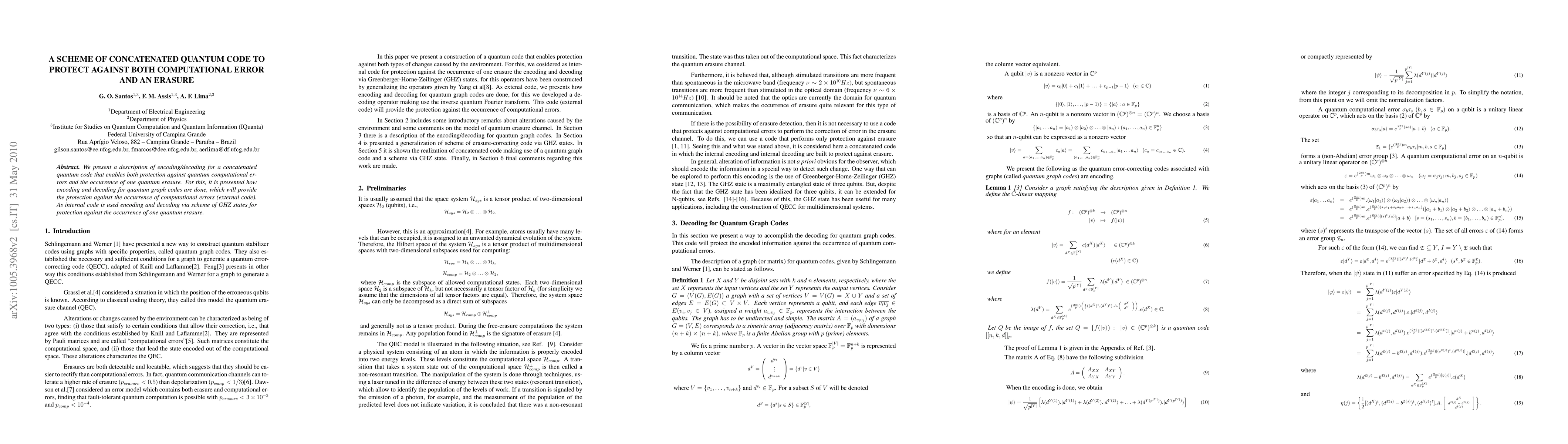 This paper proposes a concatenated quantum code that combines quantum graph codes for computational error protection and GHZ states for single quantum erasure protection, detailing the encoding and decoding processes for both components.