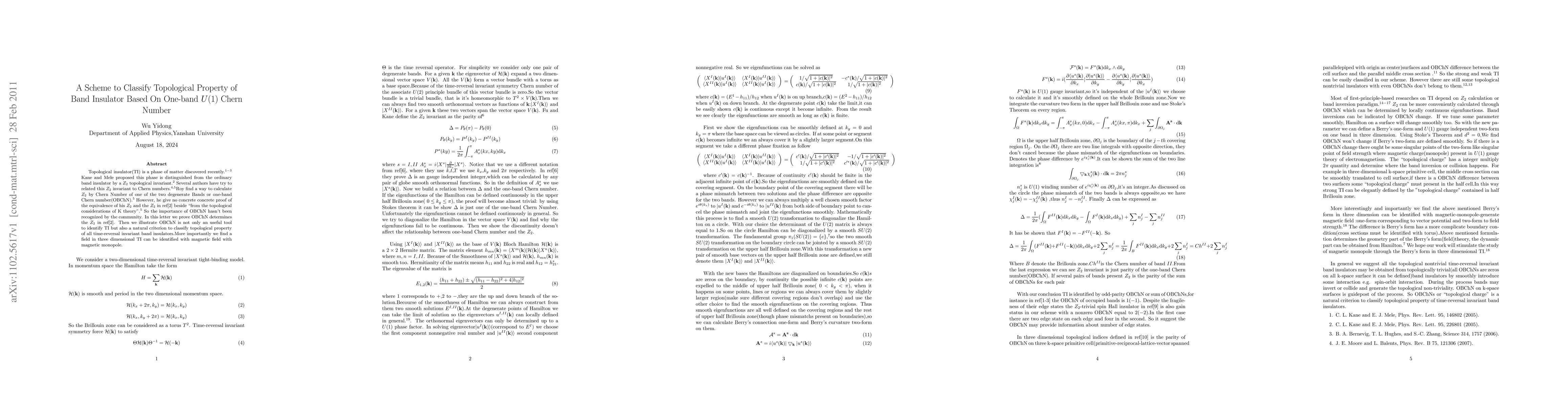 This paper proves that the one-band U(1) Chern number (OBChN) determines the Z2 topological invariant in topological insulators, establishing its significance for classifying topological properties of time-reversal invariant band insulators. It also reveals a connection between a field in three-dimensional topological insulators and a magnetic field with a magnetic monopole.
