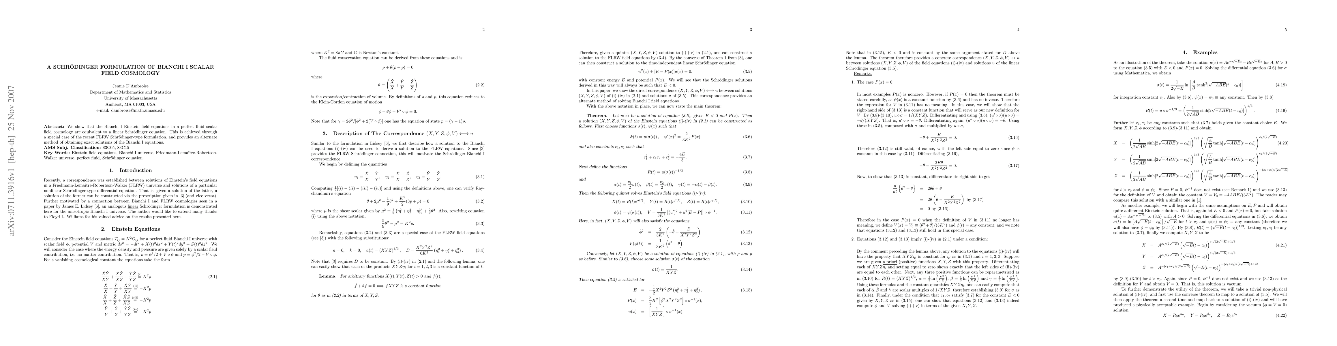 This paper demonstrates that the Bianchi I Einstein field equations in a perfect fluid scalar field cosmology can be reformulated as a linear Schrödinger equation, offering an alternative method for deriving exact solutions through a special case of the FLRW Schrödinger-type formulation.