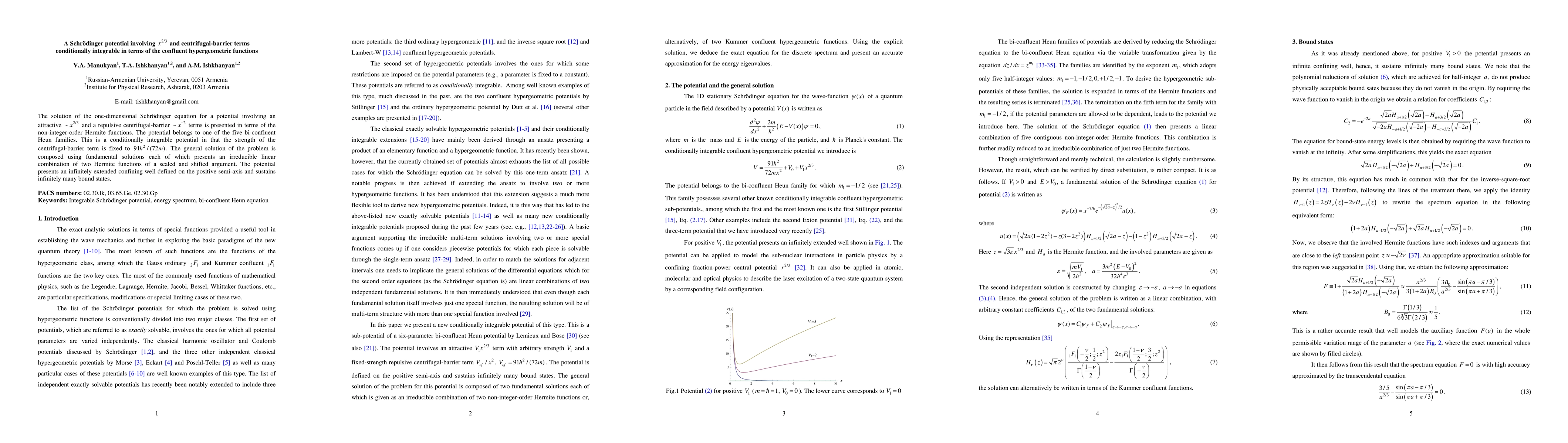 The solution of the one-dimensional Schr\"odinger equation for a potential involving an attractive $x^\frac{2}{3}$ and a repulsive centrifugal-barrier $\sim x^{-2}$ terms is presented in terms of the non-integer-order Hermite functions. The potential belongs to one of the five bi-confluent Heun families. This is a conditionally integrable potential in that the strength of the centrifugal-barrier term is fixed. The general solution of the problem is composed using fundamental solutions each of which presents an irreducible linear combination of two Hermite functions of a scaled and shifted argument. The potential presents an infinitely extended confining well defined on the positive semi-axis and sustains infinitely many bound states.