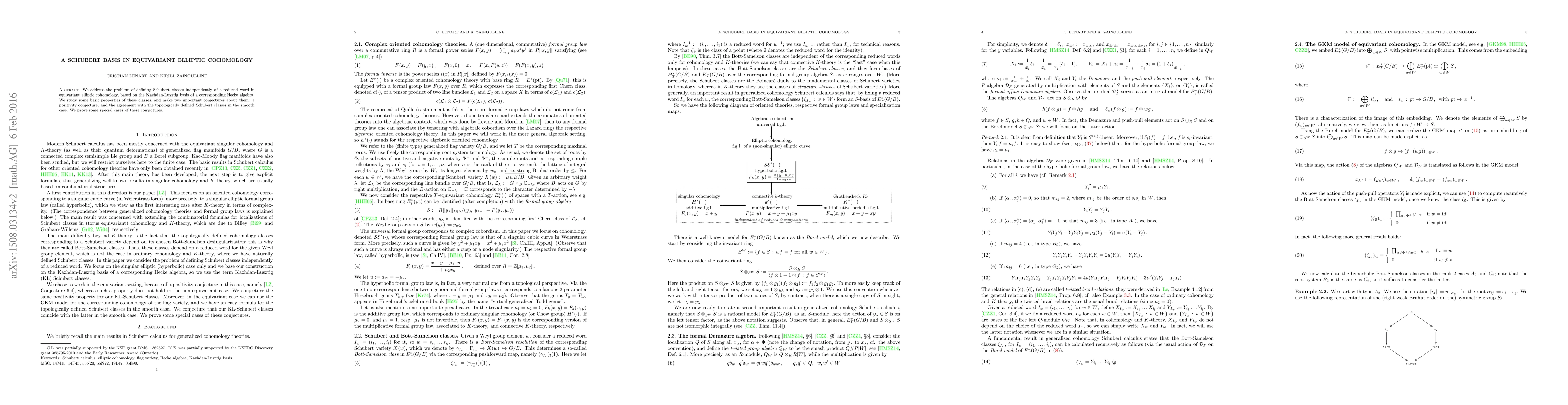 We address the problem of defining Schubert classes independently of a reduced word in equivariant elliptic cohomology, based on the Kazhdan-Lusztig basis of a corresponding Hecke algebra. We study some basic properties of these classes, and make two important conjectures about them: a positivity conjecture, and the agreement with the topologically defined Schubert classes in the smooth case. We prove some special cases of these conjectures.