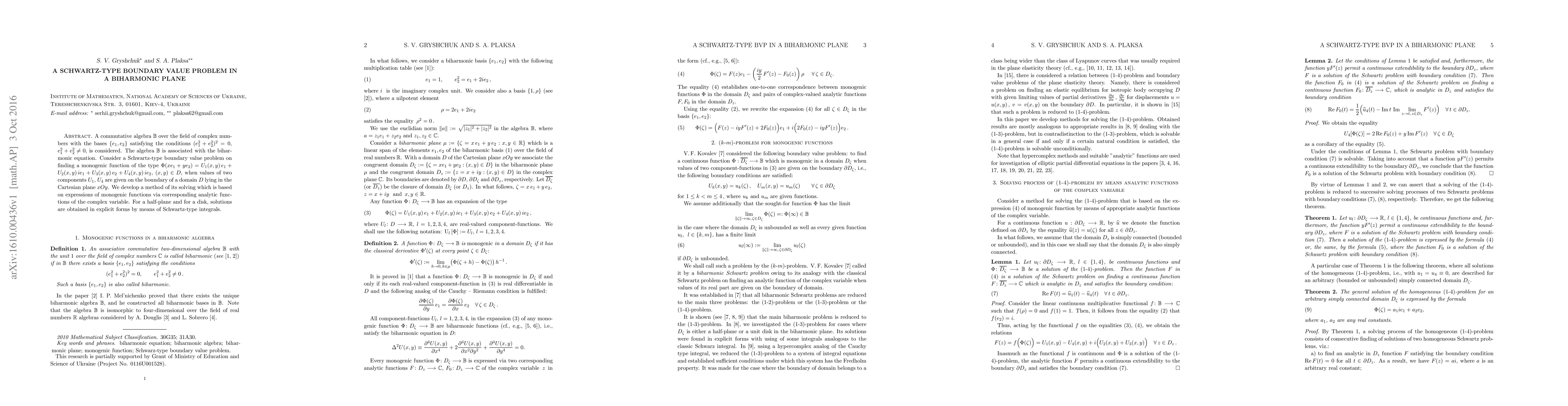 A method is presented to solve a Schwartz-type boundary value problem for monogenic functions in a biharmonic plane using analytic functions of complex variables.