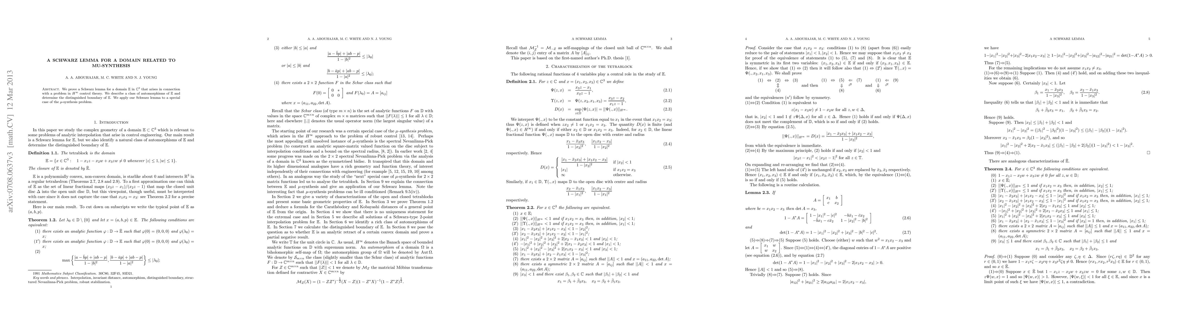 This paper proves a Schwarz lemma for a domain E in 3D complex space related to H∞ control theory, describes its automorphisms, and determines its boundary. It also derives a Schwarz-Pick lemma for a two-by-two mu-synthesis problem.