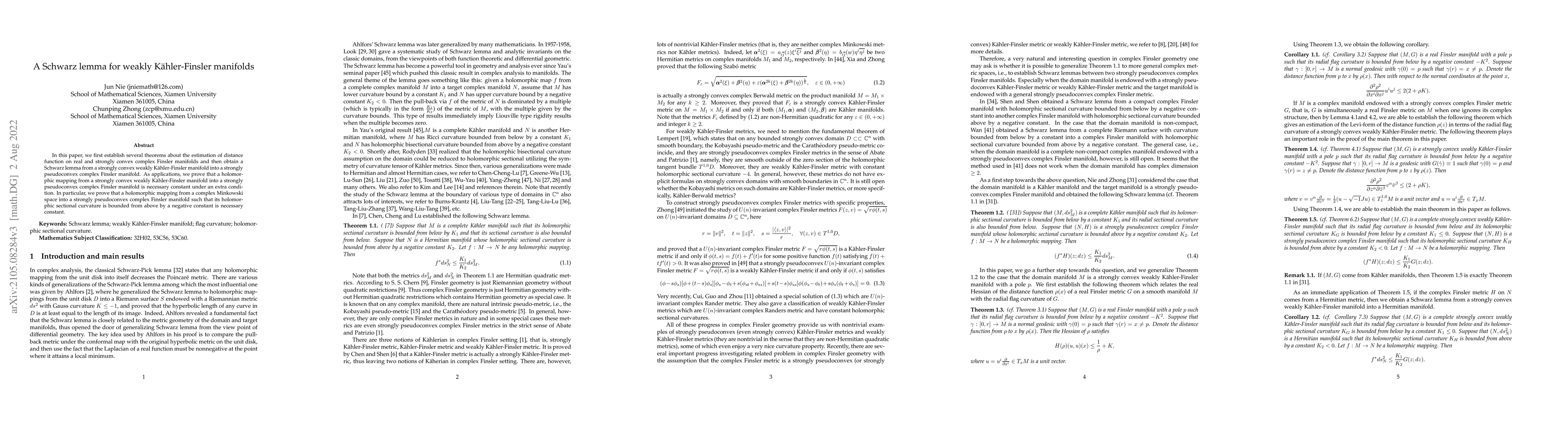 In this paper, we first establish several theorems about the estimation of distance function on real and strongly convex complex Finsler manifolds and then obtain a Schwarz lemma from a strongly convex weakly K\"ahler-Finsler manifold into a strongly pseudoconvex complex Finsler manifold. As applications, we prove that a holomorphic mapping from a strongly convex weakly K\"ahler-Finsler manifold into a strongly pseudoconvex complex Finsler manifold is necessary constant under an extra condition. In particular, we prove that a holomorphic mapping from a complex Minkowski space into a strongly pseudoconvex complex Finsler manifold such that its holomorphic sectional curvature is bounded from above by a negative constant is necessary constant.