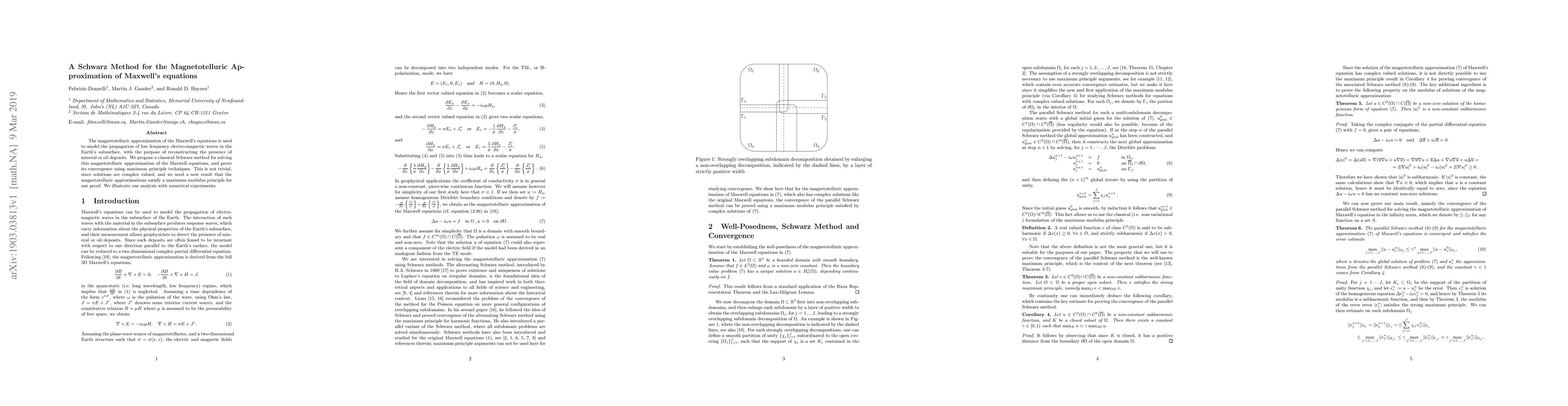 This paper proposes a Schwarz method for solving the magnetotelluric approximation of Maxwell's equations, which models low-frequency electromagnetic wave propagation in the Earth's subsurface. The authors demonstrate the method's convergence using maximum principle techniques, highlighting a new result that the approximations satisfy a maximum modulus principle.