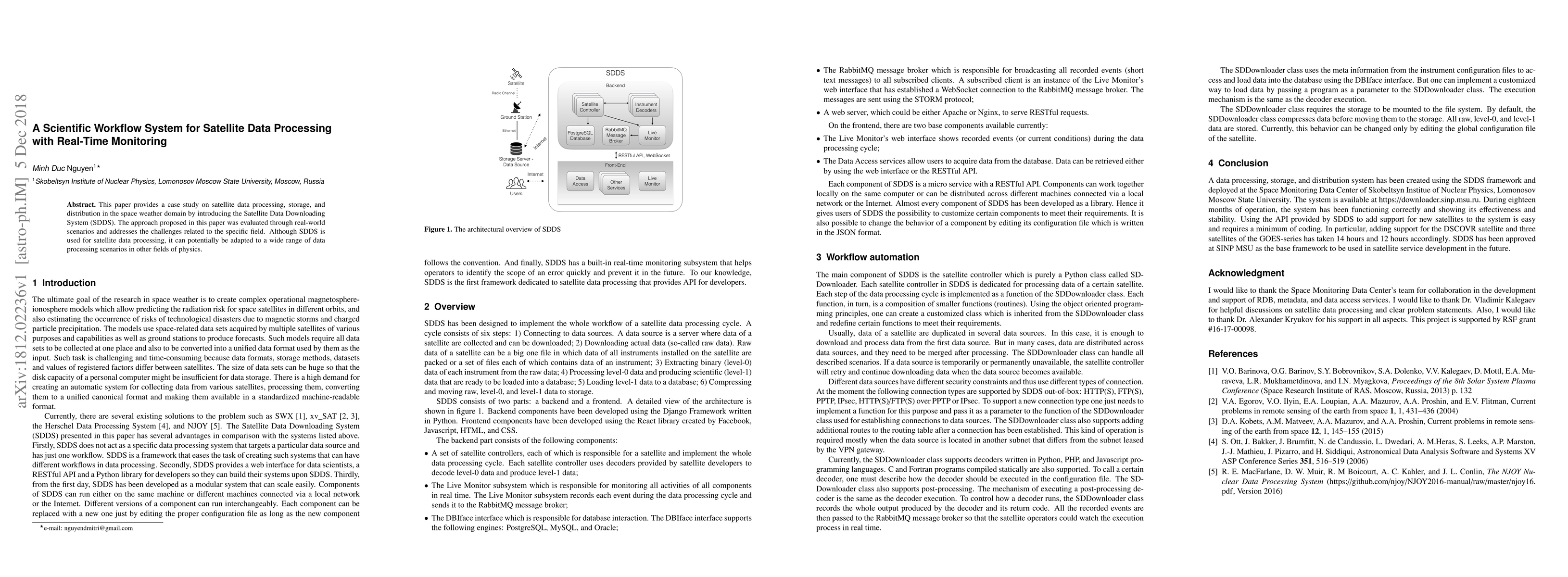 This paper provides a case study on satellite data processing, storage, and distribution in the space weather domain by introducing the Satellite Data Downloading System (SDDS). The approach proposed in this paper was evaluated through real-world scenarios and addresses the challenges related to the specific field. Although SDDS is used for satellite data processing, it can potentially be adapted to a wide range of data processing scenarios in other fields of physics.