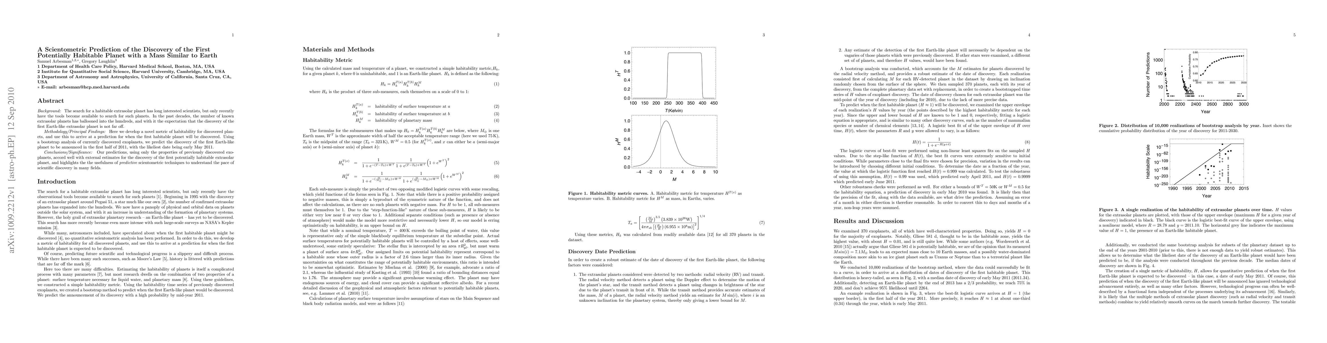 The search for a habitable extrasolar planet has long interested scientists, but only recently have the tools become available to search for such planets. In the past decades, the number of known extrasolar planets has ballooned into the hundreds, and with it the expectation that the discovery of the first Earth-like extrasolar planet is not far off. Here we develop a novel metric of habitability for discovered planets, and use this to arrive at a prediction for when the first habitable planet will be discovered. Using a bootstrap analysis of currently discovered exoplanets, we predict the discovery of the first Earth-like planet to be announced in the first half of 2011, with the likeliest date being early May 2011. Our predictions, using only the properties of previously discovered exoplanets, accord well with external estimates for the discovery of the first potentially habitable extrasolar planet, and highlights the the usefulness of predictive scientometric techniques to understand the pace of scientific discovery in many fields.