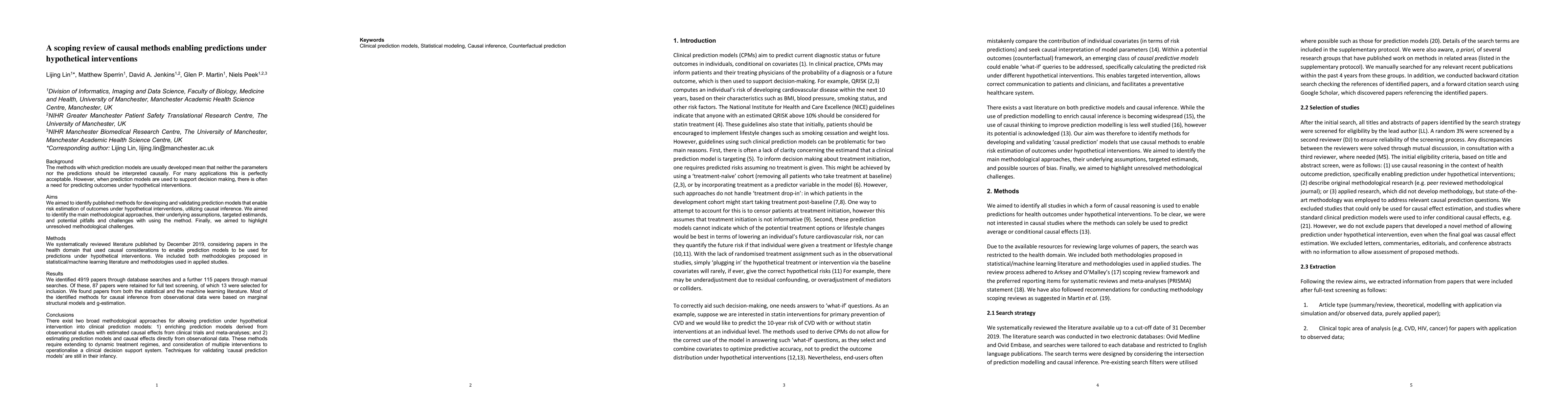Background and Aims: The methods with which prediction models are usually developed mean that neither the parameters nor the predictions should be interpreted causally. However, when prediction models are used to support decision making, there is often a need for predicting outcomes under hypothetical interventions. We aimed to identify published methods for developing and validating prediction models that enable risk estimation of outcomes under hypothetical interventions, utilizing causal inference: their main methodological approaches, underlying assumptions, targeted estimands, and potential pitfalls and challenges with using the method, and unresolved methodological challenges. Methods: We systematically reviewed literature published by December 2019, considering papers in the health domain that used causal considerations to enable prediction models to be used for predictions under hypothetical interventions. Results: We identified 4919 papers through database searches and a further 115 papers through manual searches, of which 13 were selected for inclusion, from both the statistical and the machine learning literature. Most of the identified methods for causal inference from observational data were based on marginal structural models and g-estimation. Conclusions: There exist two broad methodological approaches for allowing prediction under hypothetical intervention into clinical prediction models: 1) enriching prediction models derived from observational studies with estimated causal effects from clinical trials and meta-analyses; and 2) estimating prediction models and causal effects directly from observational data. These methods require extending to dynamic treatment regimes, and consideration of multiple interventions to operationalise a clinical decision support system. Techniques for validating 'causal prediction models' are still in their infancy.