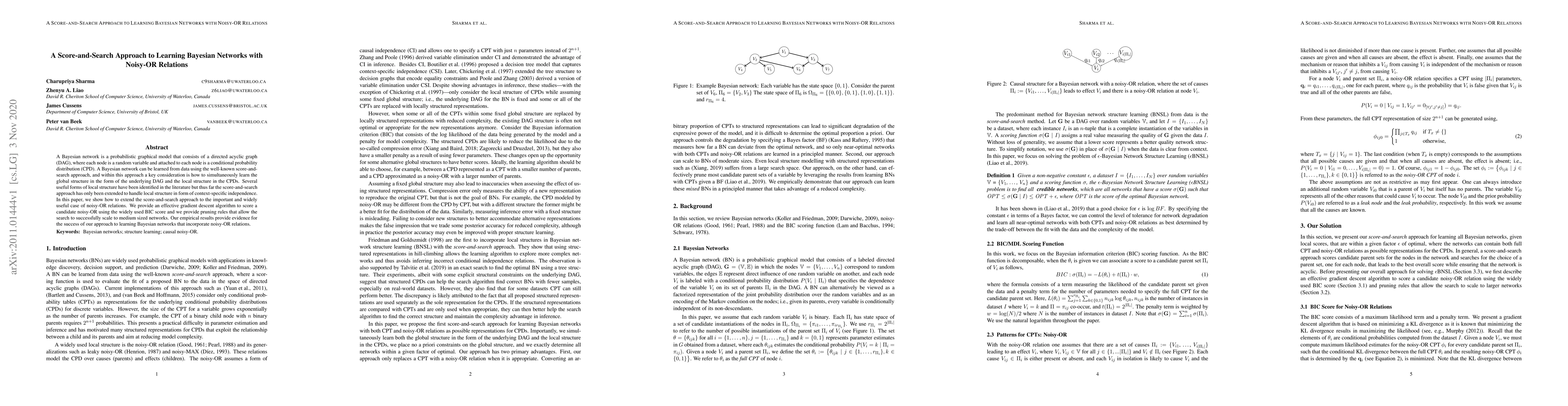 This paper extends the score-and-search approach for learning Bayesian networks to handle noisy-OR relations, providing a gradient descent algorithm and pruning rules for scaling to medium-sized networks, and demonstrating its effectiveness through empirical results.