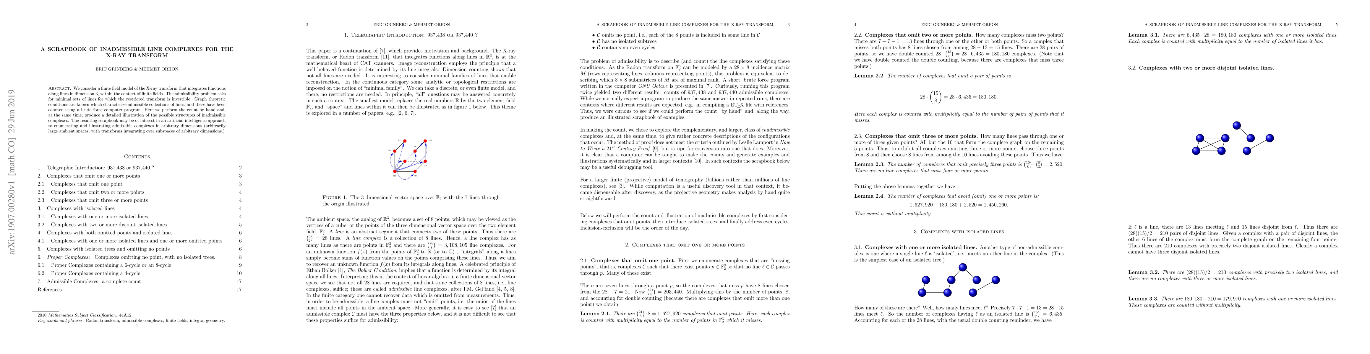We consider a finite field model of the X-ray transform that integrates functions along lines in dimension 3, within the context of finite fields. The admissibility problem asks for minimal sets of lines for which the restricted transform is invertible. Graph theoretic conditions are known which characterize admissible collections of lines, and these have been counted using a brute force computer program. Here we perform the count by hand and, at the same time, produce a detailed illustration of the possible structures of inadmissible complexes. The resulting scrapbook may be of interest in an artificial intelligence approach to enumerating and illustrating admissible complexes in arbitrary dimensions (arbitrarily large ambient spaces, with transforms integrating over subspaces of arbitrary dimensions.)