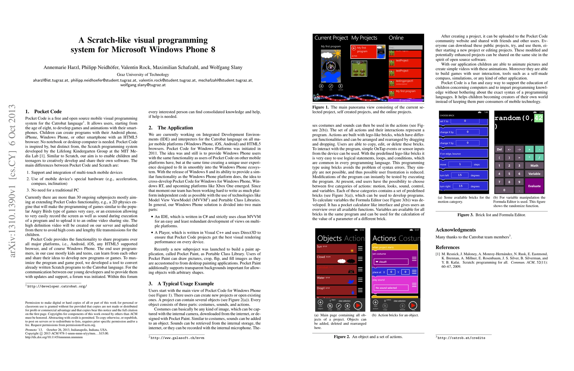 Pocket Code is a free and open source mobile visual programming system for the Catrobat language. It allows users, starting from the age of eight, to develop games and animations with their smartphones. Children can create programs with their Android phone, iPhone, Windows Phone, or other smartphone with an HTML5 browser. No notebook or desktop computer is needed. Pocket Code is inspired by, but distinct from, the Scratch programming system developed by the Lifelong Kindergarten Group at the MIT Media Lab. This tool demo describes an in-practice experience with Pocket Code, the Windows Phone IDE for the Catrobat language.