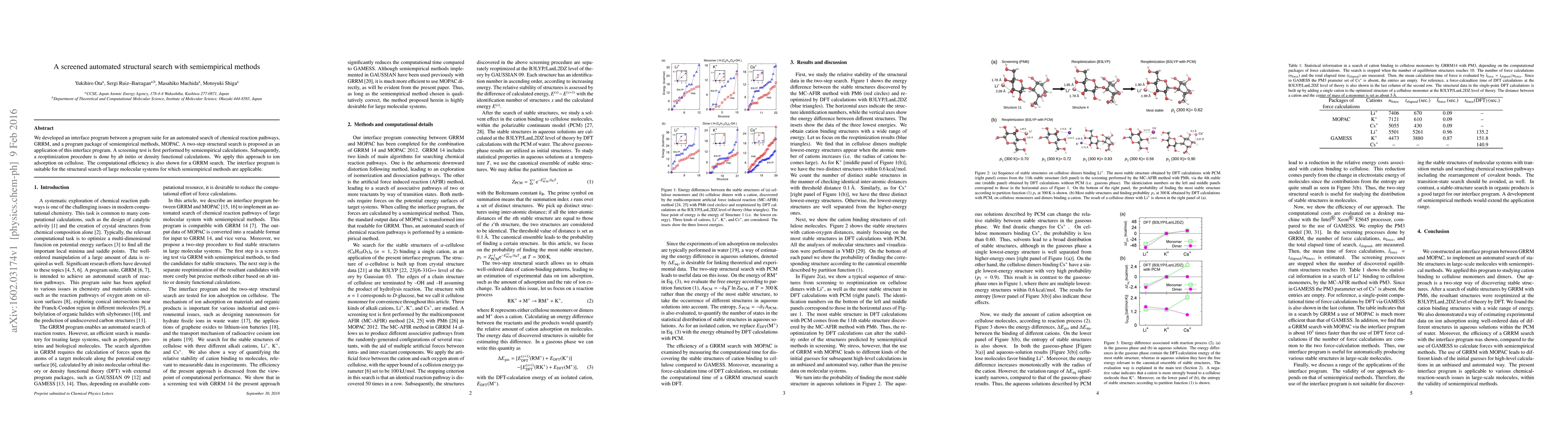 We developed an interface program between a program suite for an automated search of chemical reaction pathways, GRRM, and a program package of semiempirical methods, MOPAC. A two-step structural search is proposed as an application of this interface program. A screening test is first performed by semiempirical calculations. Subsequently, a reoptimization procedure is done by ab initio or density functional calculations. We apply this approach to ion adsorption on cellulose. The computational efficiency is also shown for a GRRM search. The interface program is suitable for the structural search of large molecular systems for which semiempirical methods are applicable.