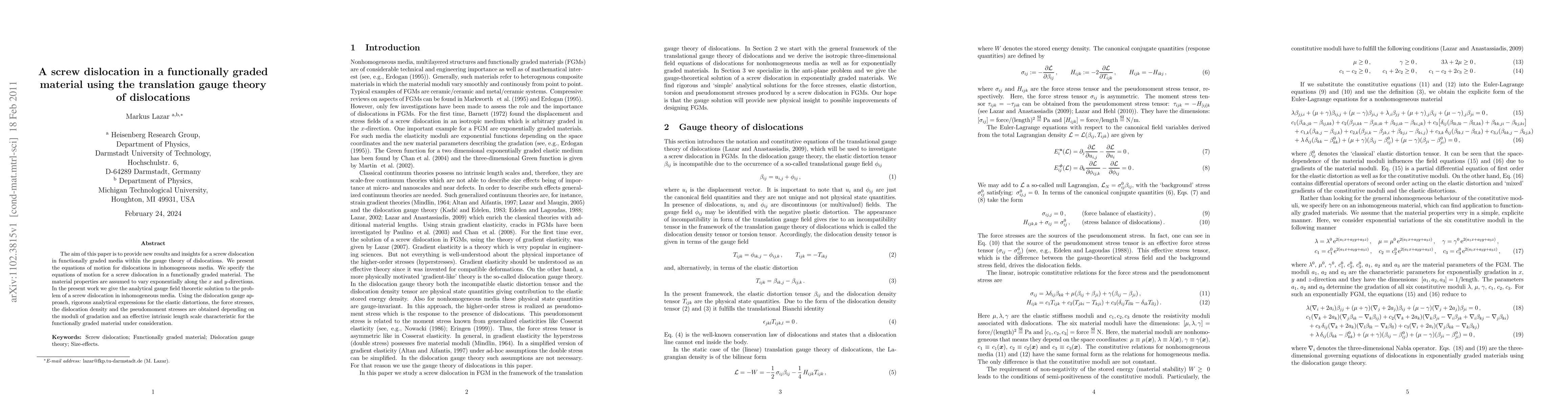 This paper investigates screw dislocations in functionally graded materials using the translation gauge theory of dislocations, deriving analytical solutions for elastic distortions, force stresses, dislocation density, and pseudomoment stresses based on material property variations along the x and y-directions.