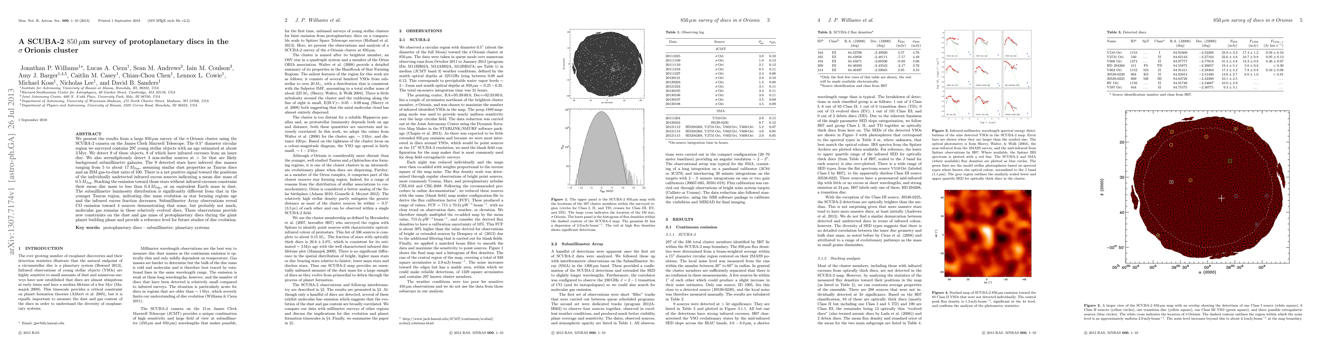 We present the results from a large 850 micron survey of the sigma Orionis cluster using the SCUBA-2 camera on the James Clerk Maxwell Telescope. The 0.5-degree diameter circular region we surveyed contains 297 young stellar objects with an age estimated at about 3Myr. We detect 9 of these objects, 8 of which have infrared excesses from an inner disc. We also serendipitously detect 3 non-stellar sources at > 5sigma that are likely background submillimetre galaxies. The 9 detected stars have inferred disc masses ranging from 5 to about 17MJup, assuming similar dust properties as Taurus discs and an ISM gas-to-dust ratio of 100. There is a net positive signal toward the positions of the individually undetected infrared excess sources indicating a mean disc mass of 0.5 MJup . Stacking the emission toward those stars without infrared excesses constrains their mean disc mass to less than 0.3MJup, or an equivalent Earth mass in dust. The submillimetre luminosity distribution is significantly different from that in the younger Taurus region, indicating disc mass evolution as star forming regions age and the infrared excess fraction decreases. Submillimeter Array observations reveal CO emission toward 4 sources demonstrating that some, but probably not much, molecular gas remains in these relatively evolved discs. These observations provide new constraints on the dust and gas mass of protoplanetary discs during the giant planet building phase and provide a reference level for future studies of disc evolution.