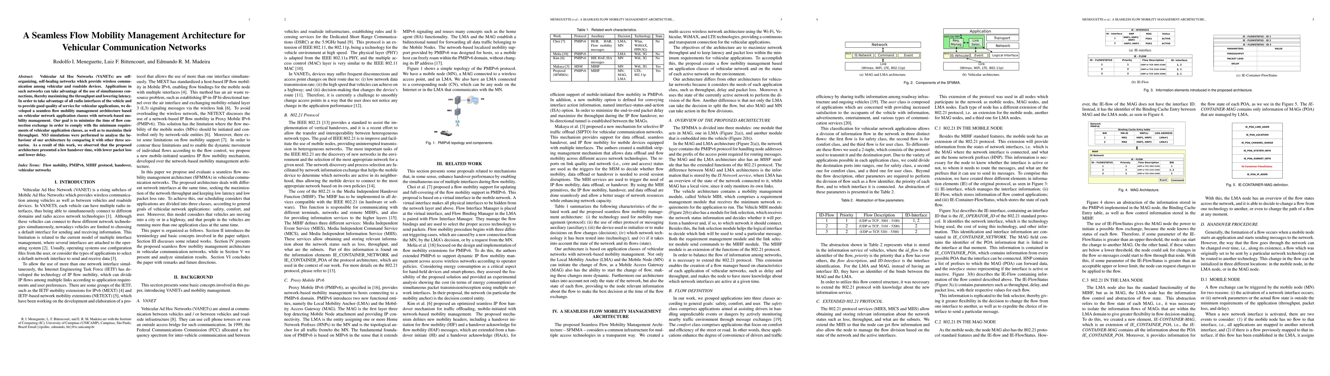 This paper proposes a seamless flow mobility management architecture for Vehicular Ad Hoc Networks (VANETs) to optimize throughput and minimize latency. NS3 simulations show that the architecture significantly reduces handover time, packet loss, and delay compared to other scenarios.