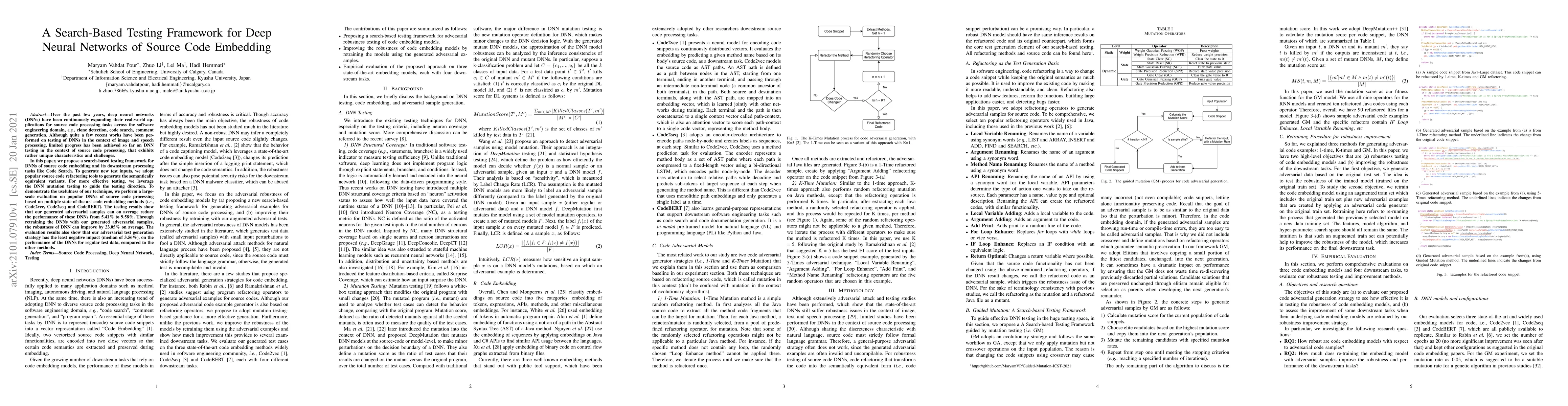 This paper proposes a search-based testing framework for deep neural networks (DNNs) used in source code embedding and related tasks like Code Search. The framework leverages DNN mutation testing and source code refactoring tools to generate adversarial samples, demonstrating significant performance reduction and improved robustness upon retraining.