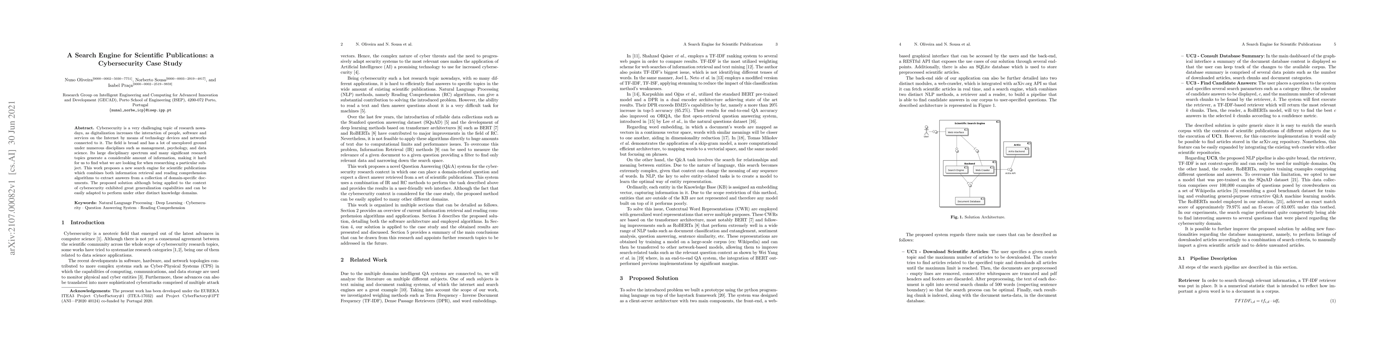Cybersecurity is a very challenging topic of research nowadays, as digitalization increases the interaction of people, software and services on the Internet by means of technology devices and networks connected to it. The field is broad and has a lot of unexplored ground under numerous disciplines such as management, psychology, and data science. Its large disciplinary spectrum and many significant research topics generate a considerable amount of information, making it hard for us to find what we are looking for when researching a particular subject. This work proposes a new search engine for scientific publications which combines both information retrieval and reading comprehension algorithms to extract answers from a collection of domain-specific documents. The proposed solution although being applied to the context of cybersecurity exhibited great generalization capabilities and can be easily adapted to perform under other distinct knowledge domains.