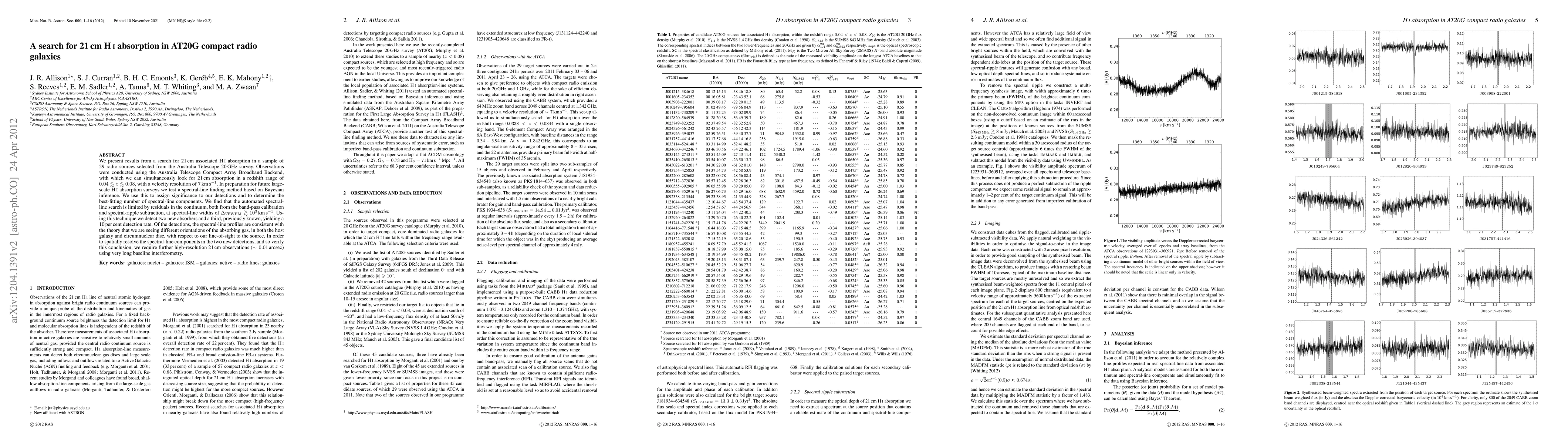 We present results from a search for 21 cm associated HI absorption in a sample of 29 radio sources selected from the Australia Telescope 20 GHz survey. Observations were conducted using the Australia Telescope Compact Array Broadband Backend, with which we can simultaneously look for 21 cm absorption in a redshift range of 0.04 < z < 0.08, with a velocity resolution of 7 km/s . In preparation for future large-scale H I absorption surveys we test a spectral-line finding method based on Bayesian inference. We use this to assign significance to our detections and to determine the best-fitting number of spectral-line components. We find that the automated spectral-line search is limited by residuals in the continuum, both from the band-pass calibration and spectral-ripple subtraction, at spectral-line widths of \Deltav_FWHM > 103 km/s . Using this technique we detect two new absorbers and a third, previously known, yielding a 10 per cent detection rate. Of the detections, the spectral-line profiles are consistent with the theory that we are seeing different orientations of the absorbing gas, in both the host galaxy and circumnuclear disc, with respect to our line-of-sight to the source. In order to spatially resolve the spectral-line components in the two new detections, and so verify this conclusion, we require further high-resolution 21 cm observations (~0.01 arcsec) using very long baseline interferometry.