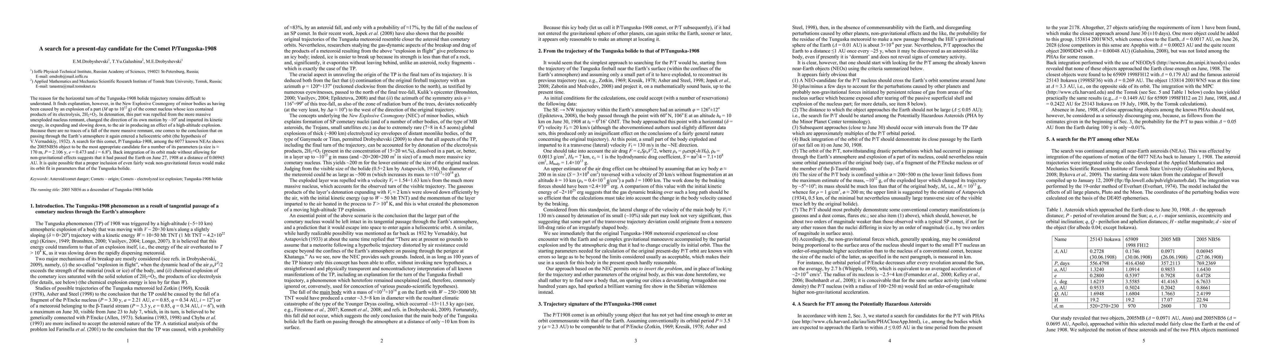 The reason for the horizontal turn of the Tunguska-1908 bolide trajectory remains difficult to understand. It finds explanation, however, in the New Explosive Cosmogony of minor bodies as having been caused by an explosion of a part (M up to 10^12 g) of the comet nucleus whose ices contained products of its electrolysis, 2H2+O2. In detonation, this part was repelled from the more massive unexploded nucleus remnant, changed the direction of its own motion by ~10^o and imparted its kinetic energy, in expanding and slowing down, to the air in producing an effect of a high-altitude explosion. Because there are no traces of a fall of the more massive remnant, one comes to the conclusion that on passing through the Earth's atmosphere it again entered a heliocentric orbit (the hypothesis of V.Vernadskiy, 1932). A search for this comet, P/Tunguska-1908, among the 6077 known NEAs shows the 2005NB56 object to be the most appropriate candidate for a number of its parameters (a size is ~ 170 m, P = 2.106 y, e = 0.473 and i = 6.8^o). Back integration of its orbit made without allowing for non-gravitational effects suggests that it had passed the Earth on June 27, 1908 at a distance of 0.06945 AU. It is quite possible that a proper inclusion of even fairly weak non-gravitational forces would make its orbit fit in parameters that of the Tunguska bolide.