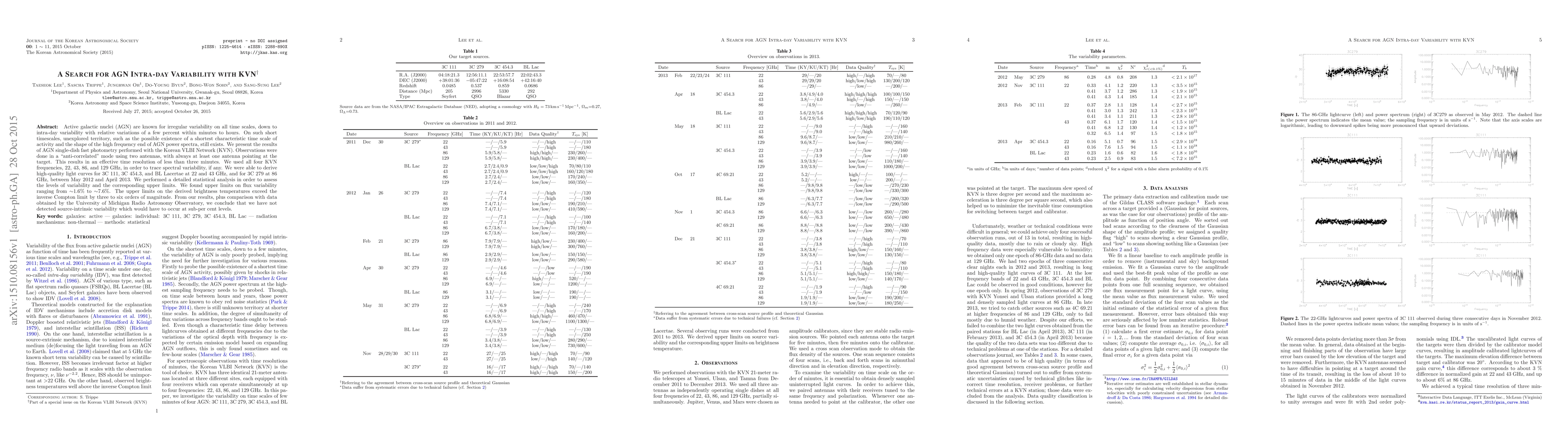 Researchers used the Korean VLBI Network to observe active galactic nuclei for intra-day variability, finding upper limits on flux variability of less than 8%.