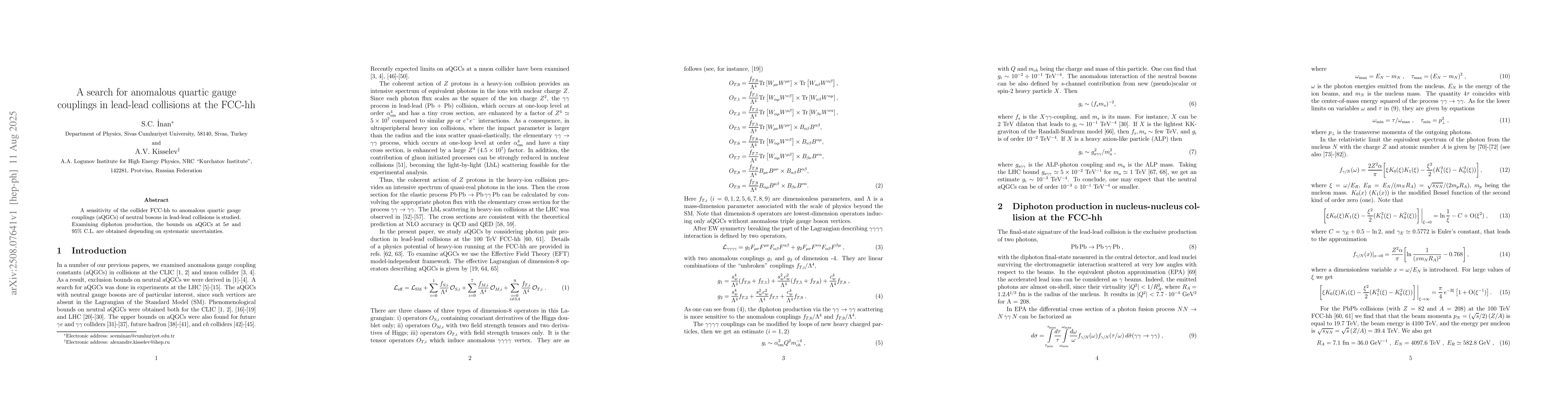 The paper presents a detailed analysis of diphoton production in lead-lead collisions at the FCC-hh to constrain anomalous quartic gauge couplings, providing precise bounds on various aQGCs.