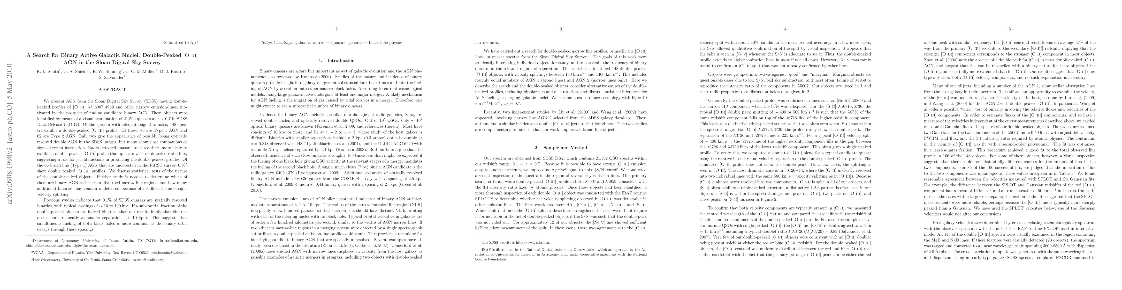 This study identifies double-peaked [OIII] profiles in AGN from the Sloan Digital Sky Survey, suggesting potential binary AGN candidates. Of 21,592 quasars examined, 148 show double-peaked [OIII] profiles, with radio-detected quasars more likely to exhibit this feature, hinting at jet interactions. Further investigation is required to determine if these profiles are due to binary AGN or disturbed narrow line regions.