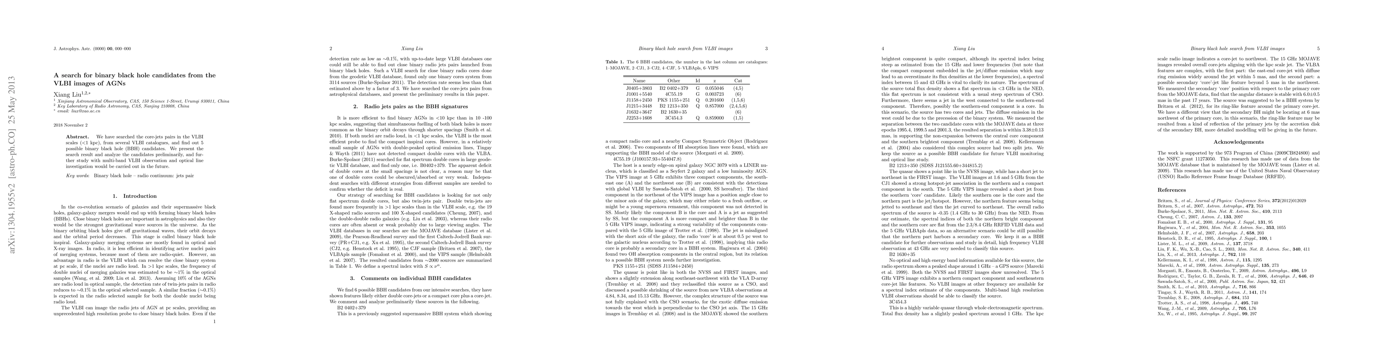 We have searched the core-jets pairs in the VLBI scales ($<$1 kpc), from several VLBI catalogues, and find out 6 possible binary black hole (BBH) candidates. We present the search result and analyze the candidates preliminarily, and further study with multi-band VLBI observation and optical line investigation would be carried out in the future.