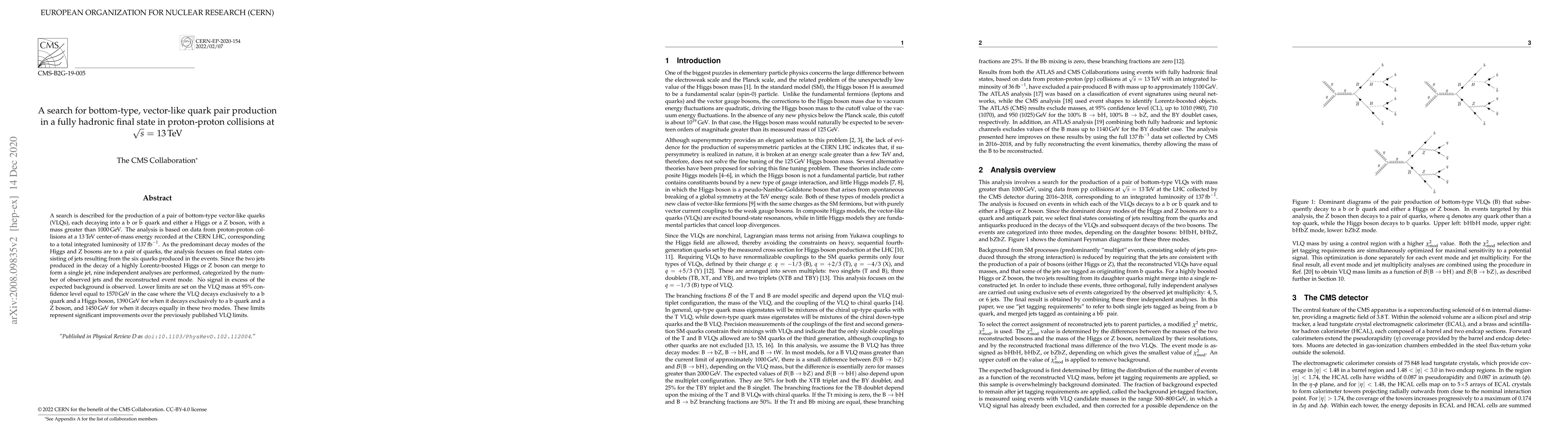 Researchers searched for production of a pair of bottom-type vector-like quarks in proton-proton collisions at 13 TeV, setting new limits on their mass.