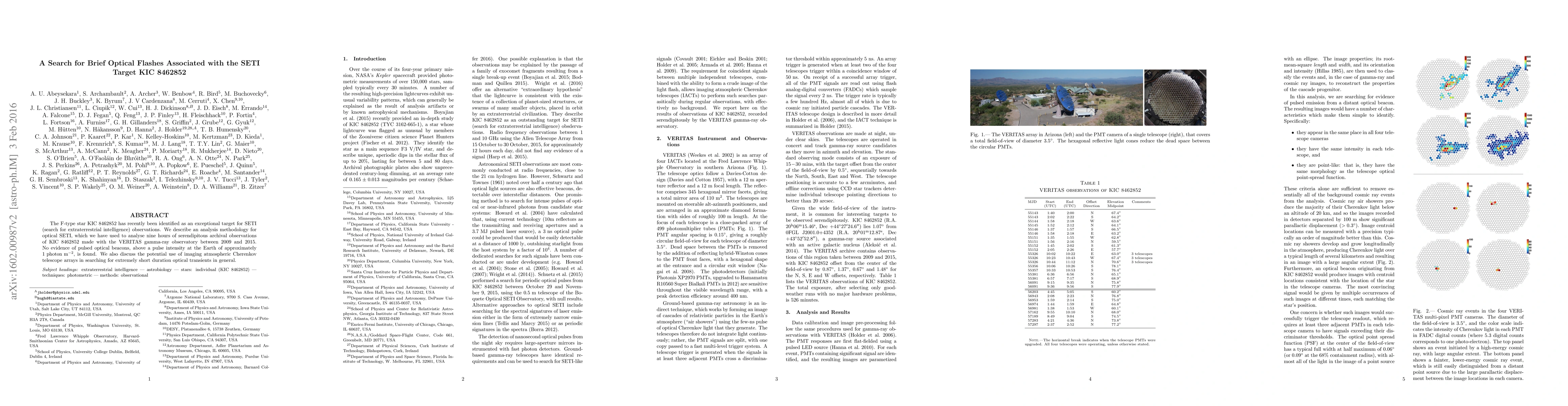 This study analyzed nine hours of archival VERITAS gamma-ray observatory data for optical signals from the SETI target KIC 8462852, finding no evidence of pulsed optical beacons brighter than 1 photon per m^2. It also explores the potential of imaging atmospheric Cherenkov telescope arrays for detecting extremely short optical transients.