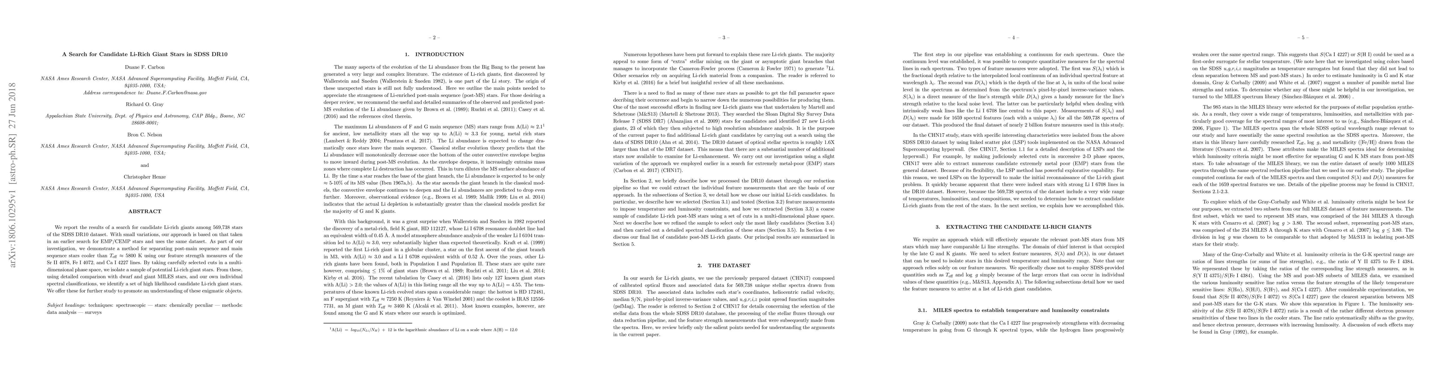 This paper reports a search for Li-rich giant stars in the SDSS DR10 dataset, isolating potential candidates using spectral line features and multi-dimensional phase space cuts. The identified high likelihood candidates are proposed for further study to enhance understanding of these rare stars.