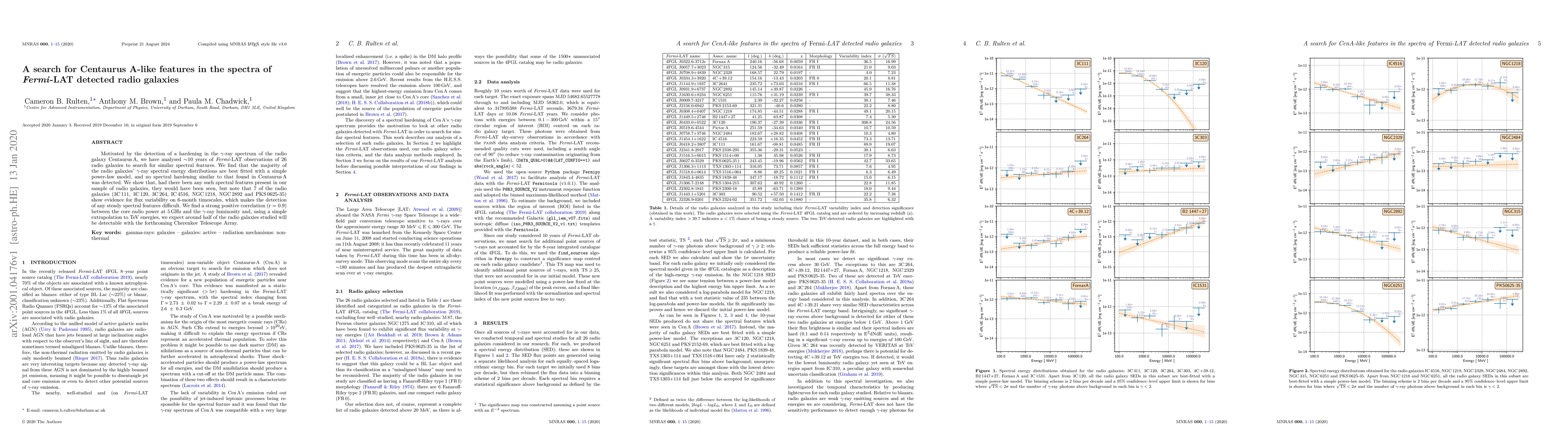 This study analyzes Fermi-LAT data from 26 radio galaxies to search for gamma-ray spectral hardening similar to Centaurus A but finds no such features. A strong correlation between core radio power at 5 GHz and gamma-ray luminosity is observed, suggesting half of these galaxies may be detectable with the Cherenkov Telescope Array.
