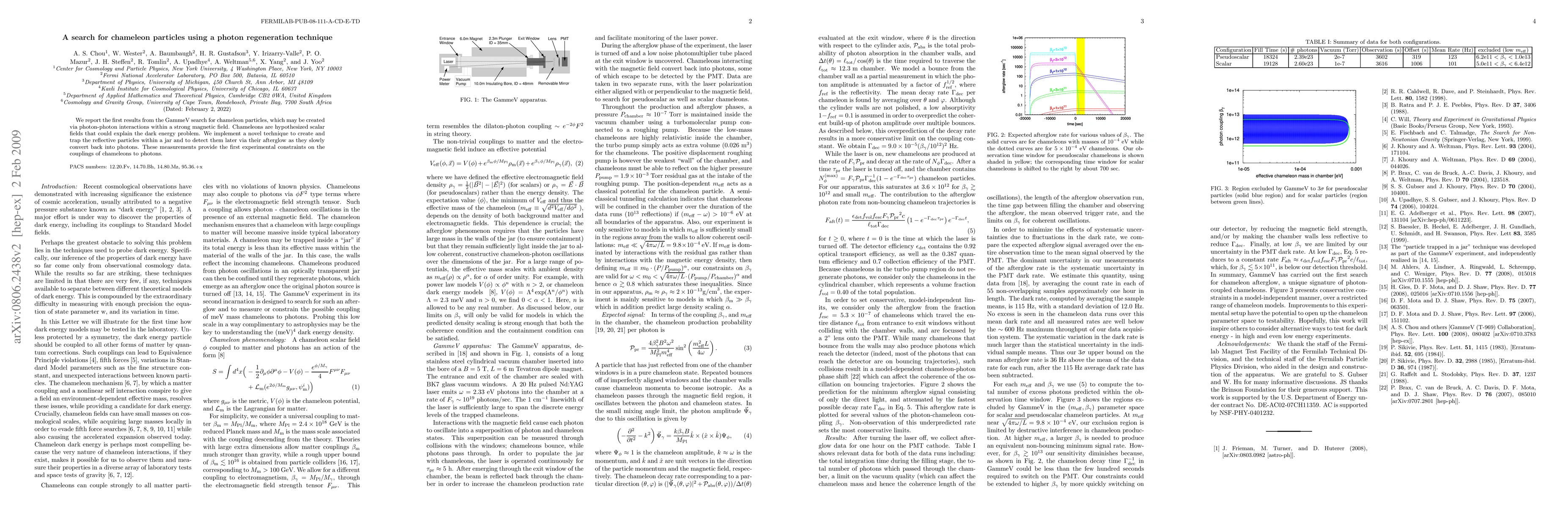 This paper reports initial findings from the GammeV experiment searching for chameleon particles, hypothesized scalar fields potentially explaining dark energy. The study employs a photon regeneration technique to detect chameleons via their afterglow, providing the first experimental constraints on their photon coupling.