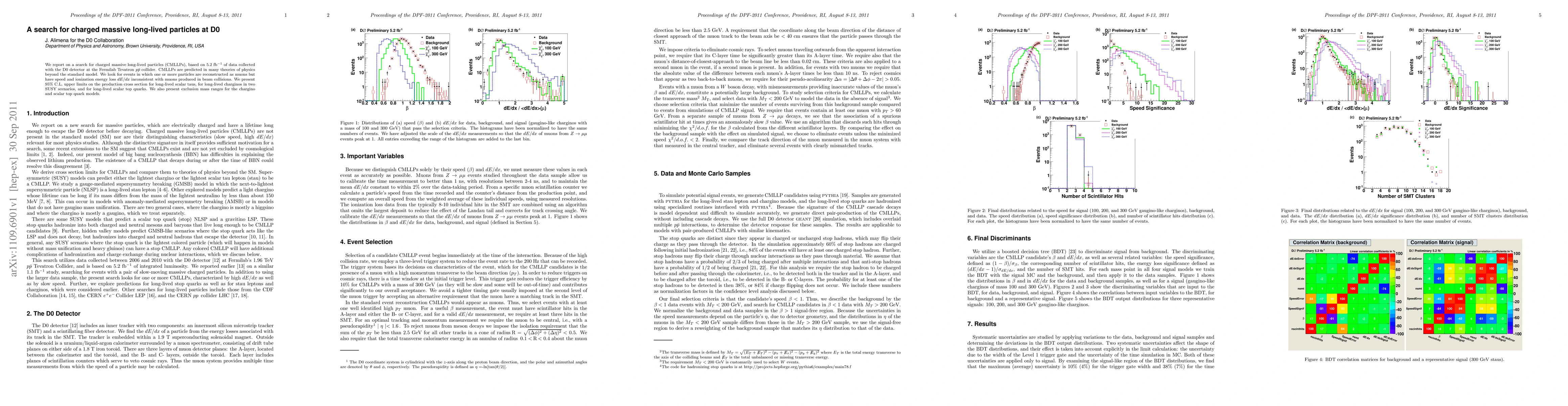 This research reports a search for charged massive long-lived particles (CMLLPs) using 5.2 fb$^{-1}$ of data from the D0 detector at the Tevatron collider. The study excludes certain mass ranges for long-lived scalar taus, charginos, and scalar top quarks, setting 95% C.L. upper limits on their production cross sections.