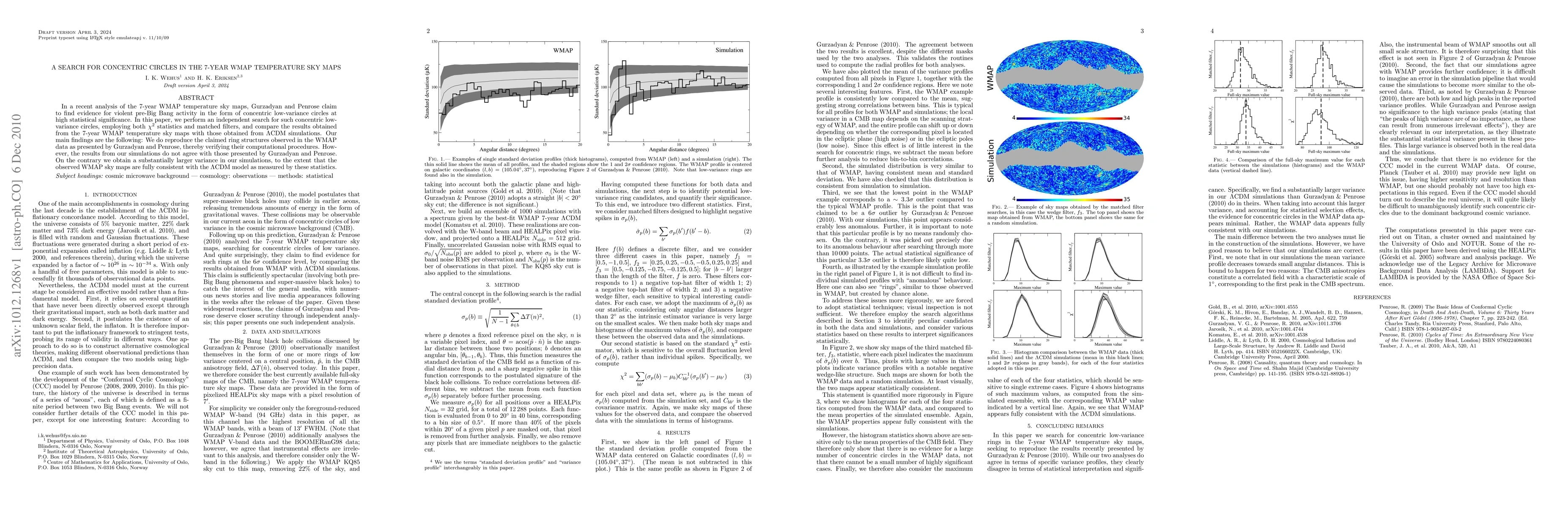 This paper independently verifies Gurzadyan and Penrose's computational procedures for finding concentric low-variance circles in WMAP data but contradicts their findings. The study employs chi^2 statistics and matched filters, showing that WMAP sky maps are consistent with the LCDM model, indicating no evidence for pre-Big Bang activity as claimed.