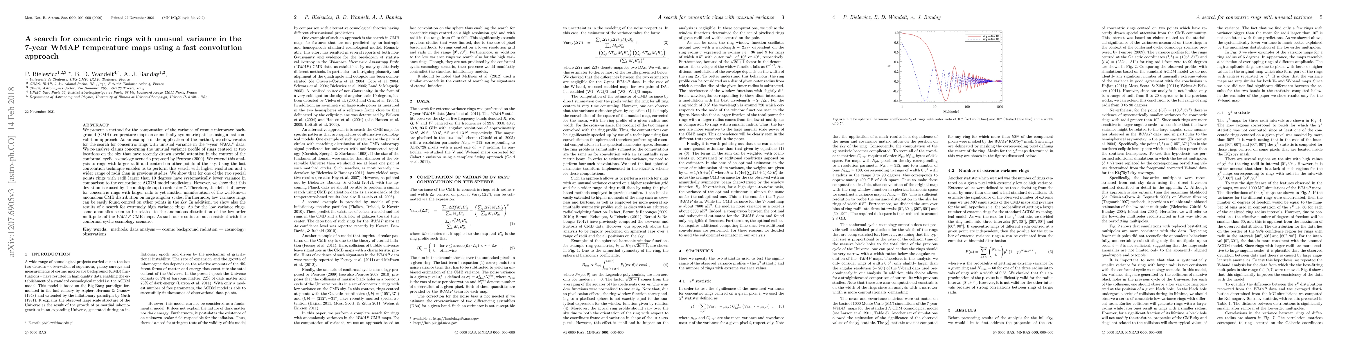 We present a method for the computation of the variance of cosmic microwave background (CMB) temperature maps on azimuthally symmetric patches using a fast convolution approach. As an example of the application of the method, we show results for the search for concentric rings with unusual variance in the 7-year WMAP data. We re-analyse claims concerning the unusual variance profile of rings centred at two locations on the sky that have recently drawn special attention in the context of the conformal cyclic cosmology scenario proposed by Penrose (2009). We extend this analysis to rings with larger radii and centred on other points of the sky. Using the fast convolution technique enables us to perform this search with higher resolution and a wider range of radii than in previous studies. We show that for one of the two special points rings with radii larger than 10 degrees have systematically lower variance in comparison to the concordance LambdaCDM model predictions. However, we show that this deviation is caused by the multipoles up to order l=7. Therefore, the deficit of power for concentric rings with larger radii is yet another manifestation of the well-known anomalous CMB distribution on large angular scales. Furthermore, low variance rings can be easily found centred on other points in the sky. In addition, we show also the results of a search for extremely high variance rings. As for the low variance rings, some anomalies seem to be related to the anomalous distribution of the low-order multipoles of the WMAP CMB maps. As such our results are not consistent with the conformal cyclic cosmology scenario.