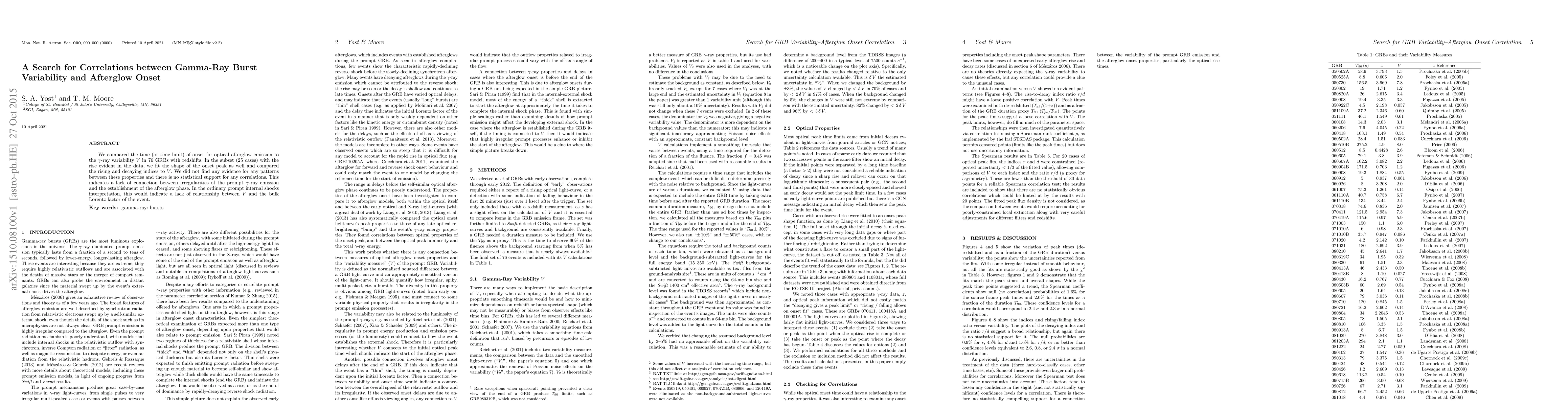 We compared the time (or time limit) of onset for optical afterglow emission to the gamma-ray variability V in 76 GRBs with redshifts. In the subset (25 cases) with the rise evident in the data, we fit the shape of the onset peak as well and compared the rising and decaying indices to V. We did not find any evidence for any patterns between these properties and there is no statistical support for any correlations. This indicates a lack of connection between irregularities of the prompt gamma-ray emission and the establishment of the afterglow phase. In the ordinary prompt internal shocks interpretation, this would indicate a lack of relationship between V and the bulk Lorentz factor of the event.