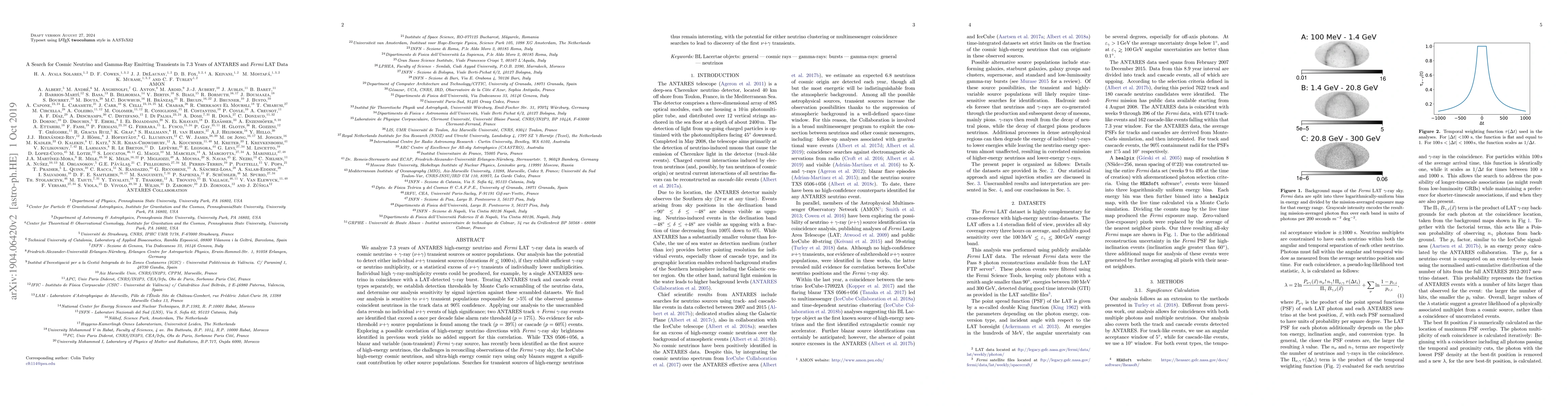 We analyze 7.3 years of ANTARES high-energy neutrino and Fermi LAT {\gamma}-ray data in search of cosmic neutrino + {\gamma}-ray ({\nu}+{\gamma}) transient sources or source populations. Our analysis has the potential to detect either individual {\nu}+{\gamma} transient sources (durations {\delta}t < 1000~s), if they exhibit sufficient {\gamma}-ray or neutrino multiplicity, or a statistical excess of {\nu}+{\gamma} transients of lower multiplicities. Treating ANTARES track and cascade event types separately, we establish detection thresholds by Monte Carlo scrambling of the neutrino data, and determine our analysis sensitivity by signal injection against scrambled datasets. We find our analysis is sensitive to {\nu}+{\gamma} transient populations responsible for $>$5\% of the observed gamma-coincident neutrinos in the track data at 90\% confidence. Applying our analysis to the unscrambled data reveals no individual {\nu}+{\gamma} events of high significance; two ANTARES track + Fermi {\gamma}-ray events are identified that exceed a once per decade false alarm rate threshold ($p=17\%$). No evidence for subthreshold {\nu}+{\gamma} source populations is found among the track ($p=39\%$) or cascade ($p=60\%$) events. While TXS 0506+056, a blazar and variable (non-transient) Fermi {\gamma}-ray source, has recently been identified as the first source of high-energy neutrinos, the challenges in reconciling observations of the Fermi {\gamma}-ray sky, the IceCube high-energy cosmic neutrinos, and ultra-high energy cosmic rays using only blazars suggest a significant contribution by other source populations. Searches for transient sources of high-energy neutrinos remain interesting, with the potential for neutrino clustering or multimessenger coincidence searches to lead to discovery of the first {\nu}+{\gamma} transients.