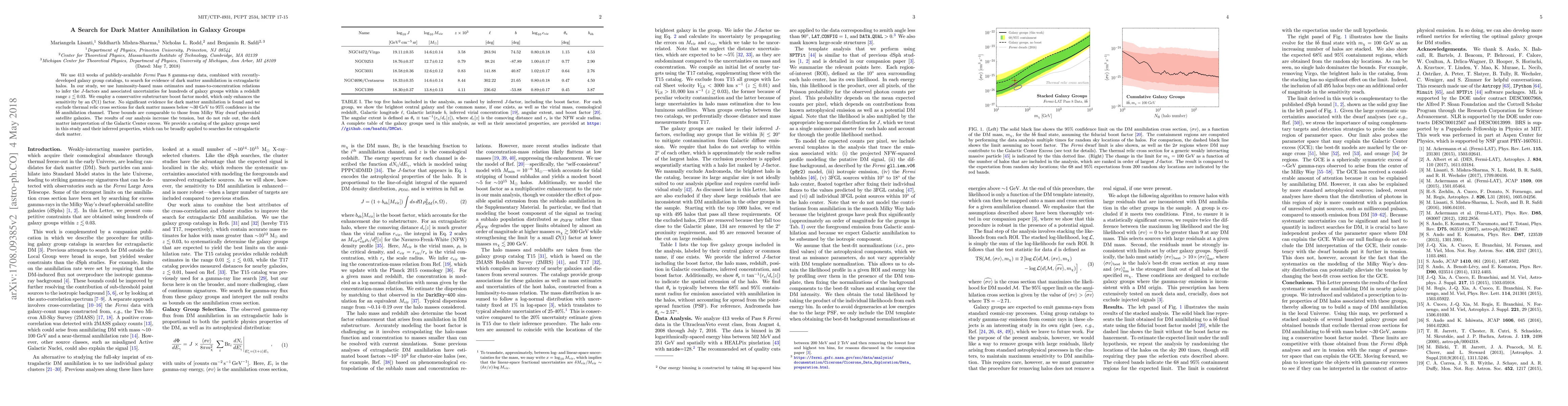 This paper analyzes Fermi gamma-ray data to search for dark matter annihilation in galaxy groups, finding no significant evidence and setting new limits on thermal relic cross sections for dark matter masses below 30 GeV. The results add to the ongoing debate regarding the dark matter interpretation of the Galactic Center excess.