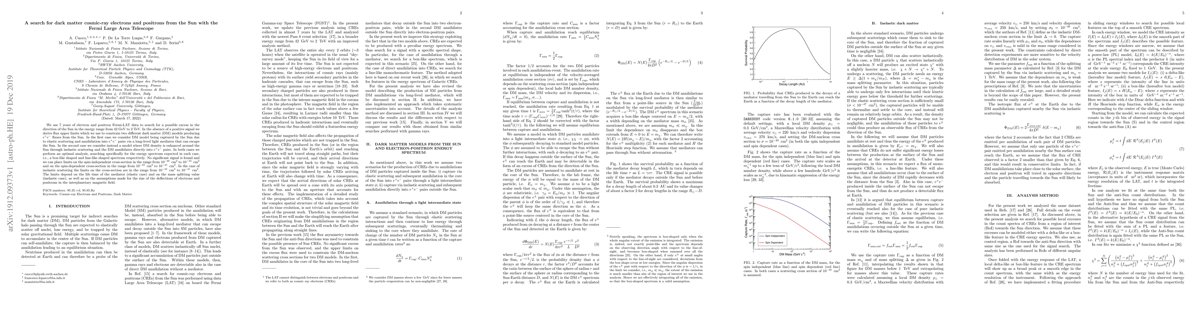 We use 7 years of electron and positron Fermi-LAT data to search for a possible excess in the direction of the Sun in the energy range from 42 GeV to 2 TeV. In the absence of a positive signal we derive flux upper limits which we use to constrain two different dark matter (DM) models producing $e^+ e^-$ fluxes from the Sun. In the first case we consider DM model being captured by the Sun due to elastic scattering and annihilation into $e^+ e^-$ pairs via a long-lived light mediator that can escape the Sun. In the second case we consider instead a model where DM density is enhanced around the Sun through inelastic scattering and the DM annihilates directly into $e^+ e^-$ pairs. In both cases we perform an optimal analysis, searching specifically for the energy spectrum expected in each case, i.e., a box-like shaped and line-like shaped spectrum respectively. No significant signal is found and we can place limits on the spin-independent cross-section in the range from $10^{-46}~cm^2$ to $10^{-44}~cm^2$ and on the spin-dependent cross-section in the range from $10^{-43}~cm^2$ to $10^{-41}~cm^2$. In the case of inelastic scattering the limits on the cross-section are in the range from $10^{-43}~cm^2$ to $10^{-41}~cm^2$. The limits depend on the life time of the mediator (elastic case) and on the mass splitting value (inelastic case), as well as on the assumptions made for the size of the deflections of electrons and positrons in the interplanetary magnetic field.