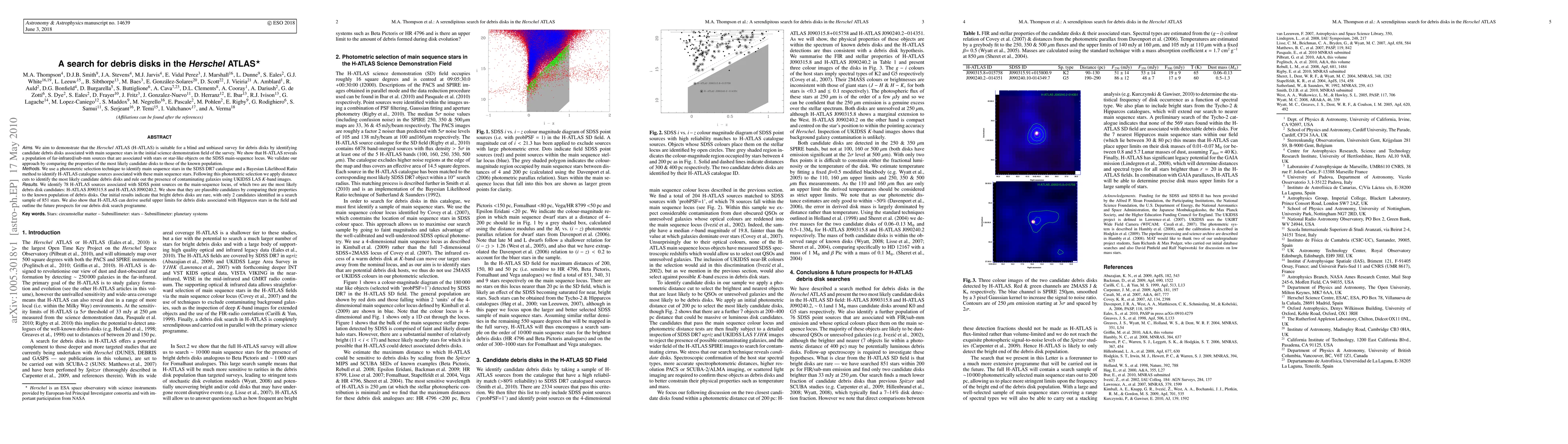 Aims: We aim to demonstrate that the Herschel ATLAS (H-ATLAS) is suitable for a blind and unbiased survey for debris disks by identifying candidate debris disks associated with main sequence stars in the initial science demonstration field of the survey. We show that H-ATLAS reveals a population of far-infrared/sub-mm sources that are associated with stars or star-like objects on the SDSS main-sequence locus. We validate our approach by comparing the properties of the most likely candidate disks to those of the known population. Methods: We use a photometric selection technique to identify main sequence stars in the SDSS DR7 catalogue and a Bayesian Likelihood Ratio method to identify H-ATLAS catalogue sources associated with these main sequence stars. Following this photometric selection we apply distance cuts to identify the most likely candidate debris disks and rule out the presence of contaminating galaxies using UKIDSS LAS K-band images. Results: We identify 78 H-ATLAS sources associated with SDSS point sources on the main-sequence locus, of which two are the most likely debris disk candidates: H-ATLAS J090315.8 and H-ATLAS J090240.2. We show that they are plausible candidates by comparing their properties to the known population of debris disks. Our initial results indicate that bright debris disks are rare, with only 2 candidates identified in a search sample of 851 stars. We also show that H-ATLAS can derive useful upper limits for debris disks associated with Hipparcos stars in the field and outline the future prospects for our debris disk search programme.