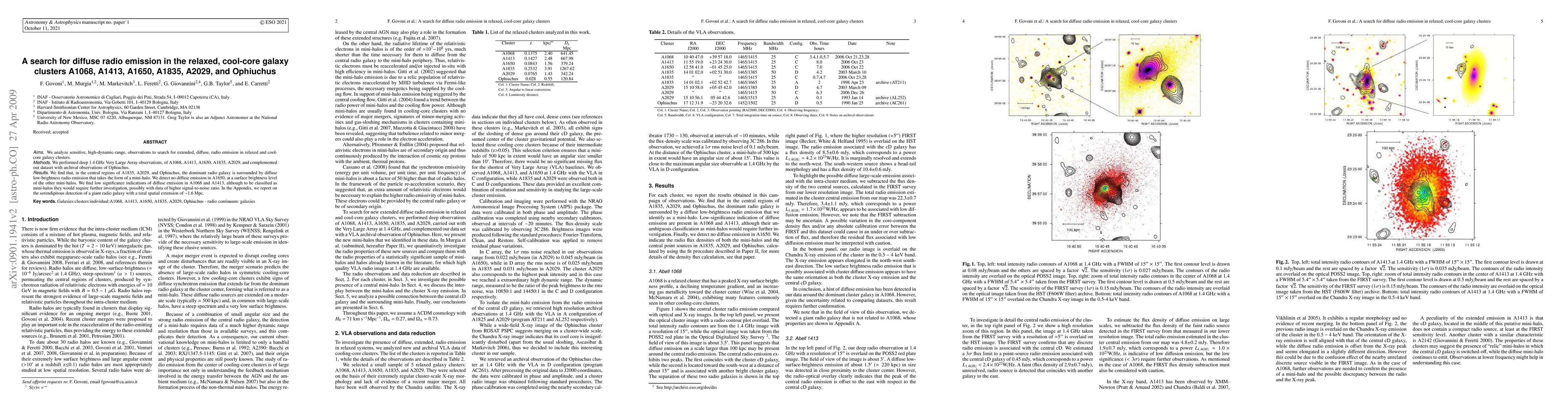 The study uses deep 1.4 GHz VLA observations to search for diffuse radio emission in relaxed, cool-core galaxy clusters. It finds mini-halos of diffuse radio emission around dominant radio galaxies in A1835, A2029, and Ophiuchus, but detects no such emission in A1650 and only low-significance indications in A1068 and A1413.