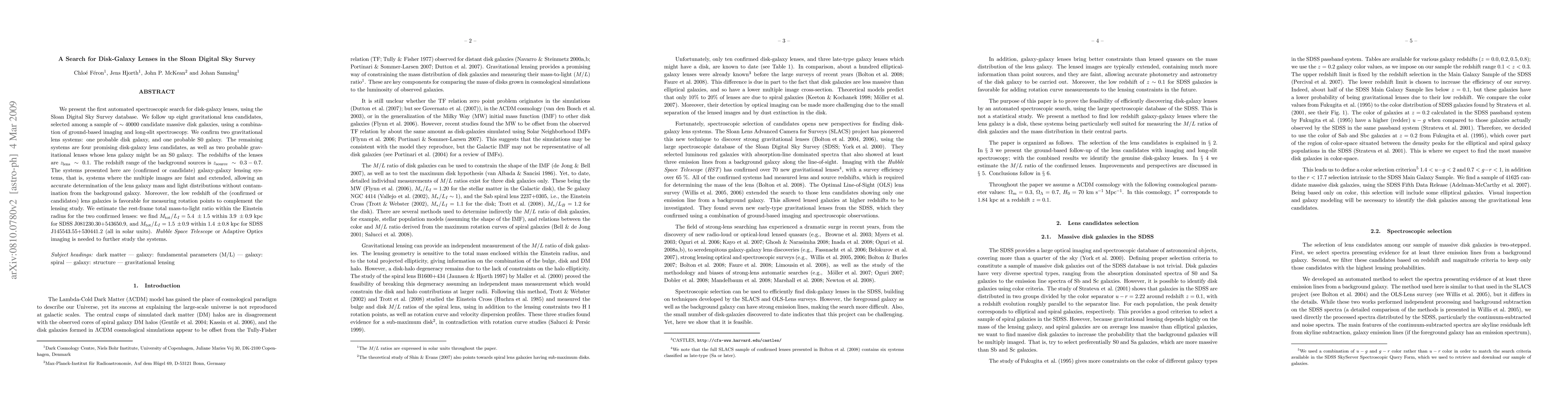 This paper reports an automated search for disk-galaxy lenses in the Sloan Digital Sky Survey, confirming two gravitational lens systems and identifying several promising candidates. The study highlights the potential for accurate mass-to-light ratio measurements due to the low redshifts of the lens galaxies.